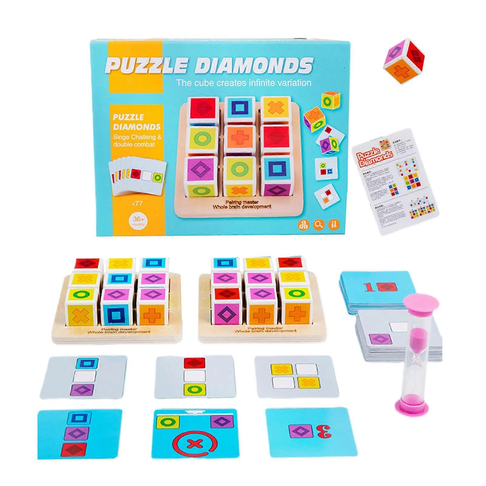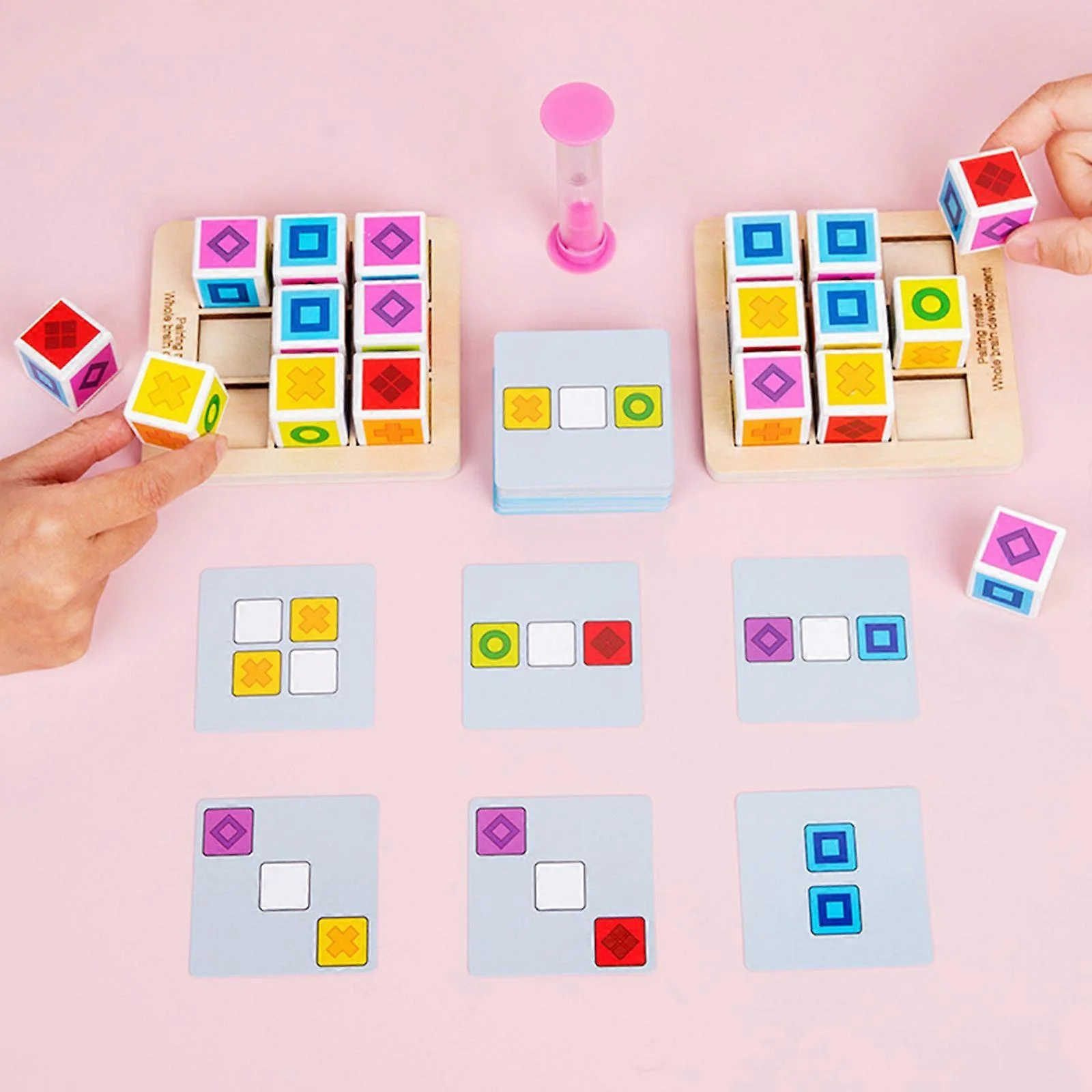 Chaque bloc présente un symbole différent, et les cartes défis indiquent les combinaisons à reproduire. L’enfant peut jouer seul, contre la montre, ou à deux pour un défi interactif.
