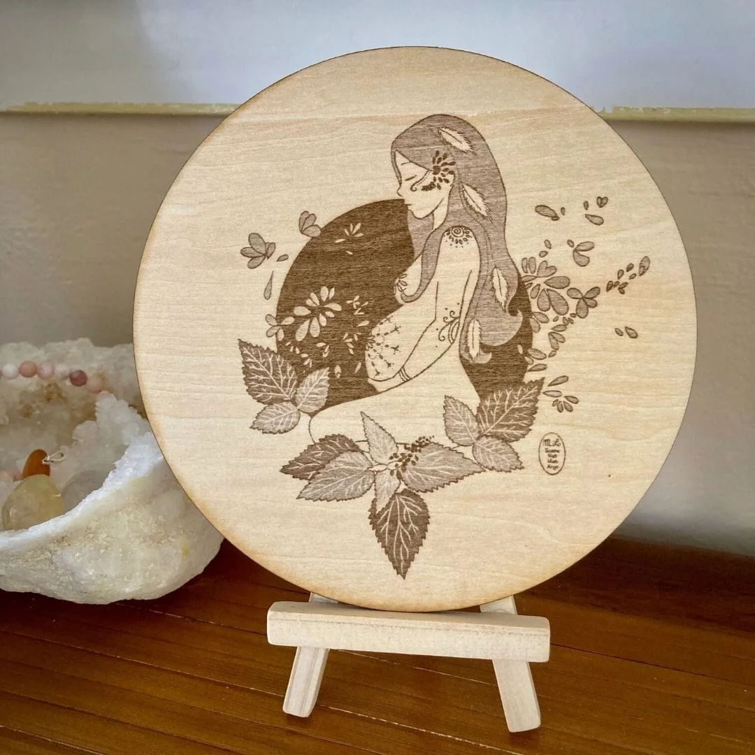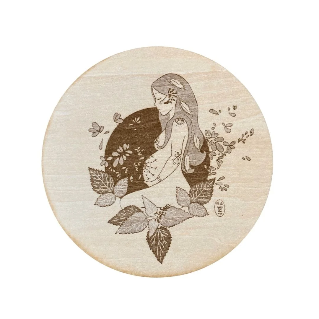 10 lunes à porter la vie 10 lunes à t’attendre, à te deviner 10 lunes d’interrogations, de peurs, de joies 10 lunes à espérer la vie et à craindre la mort 10 lunes de reconnection à soi-même 10 lunes de plénitude 10 lunes pour te donner la vie Gravure sur bois de tilleul entièrement conçue et réalisée en Bourgogne, France Diamètre 14 cm, épaisseur 3 mm Chaque pièce est unique et présente ses propres irrégularités dues au processus de gravure et au veinage du bois.
