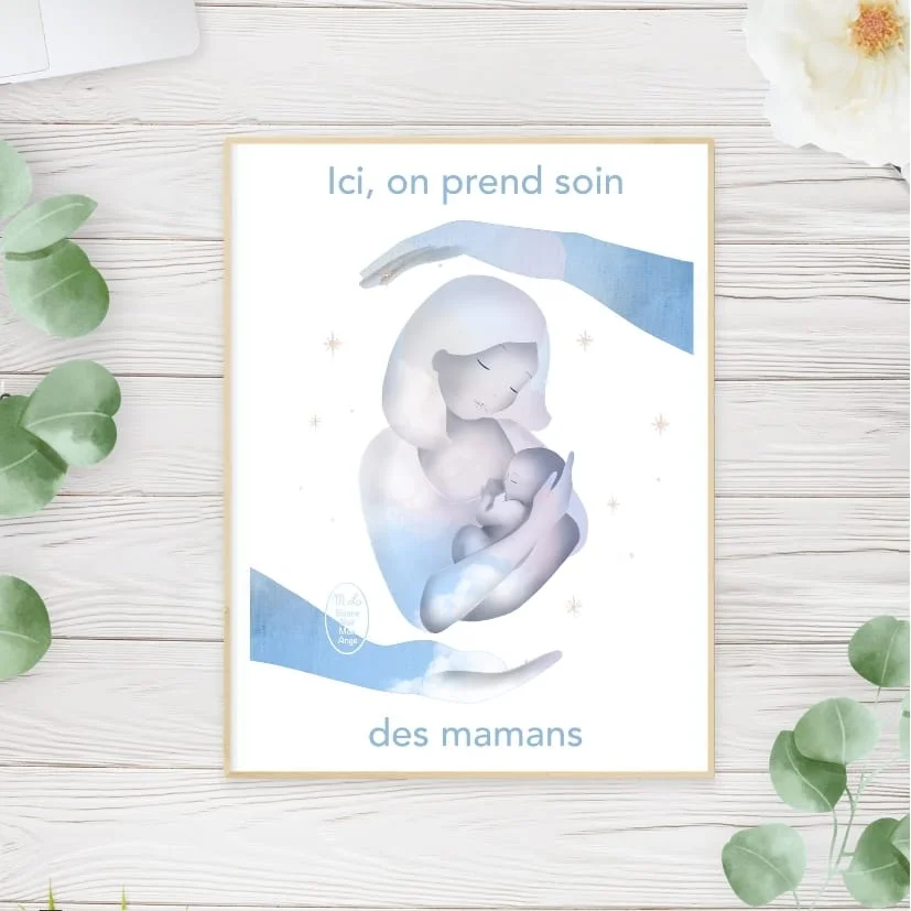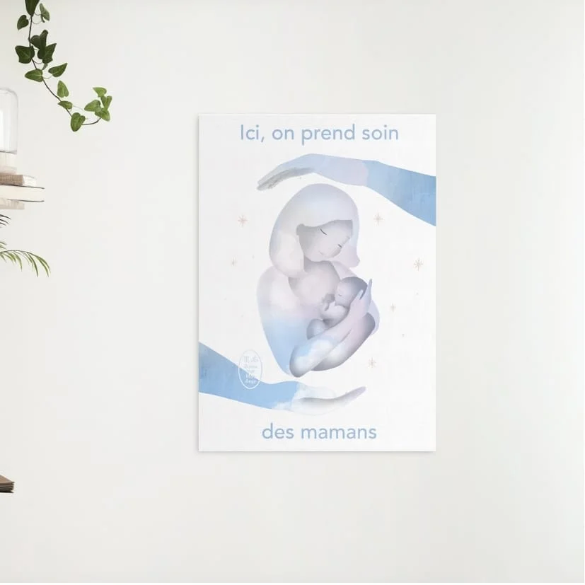 Affichez vos valeurs avec douceur et bienveillance : dans une salle d’attente, un cabinet, derrière une vitre… Ensemble, petit à petit, chacune à notre échelle, nous allons faire changer la vision du post-partum : et à mon avis, nous sommes encore loin d’imaginer l’impact énorme que cela pourra avoir pour nous, pour nos enfants, et pour les générations futures. Impression avec amour en France sur papier d’art 324 g/m². Signature à la main au verso. Toile grand format 60 x 40 cm à texture fine, tendue sur un cadre en bois fabriqué à la main. Encres sans aucun solvant et…