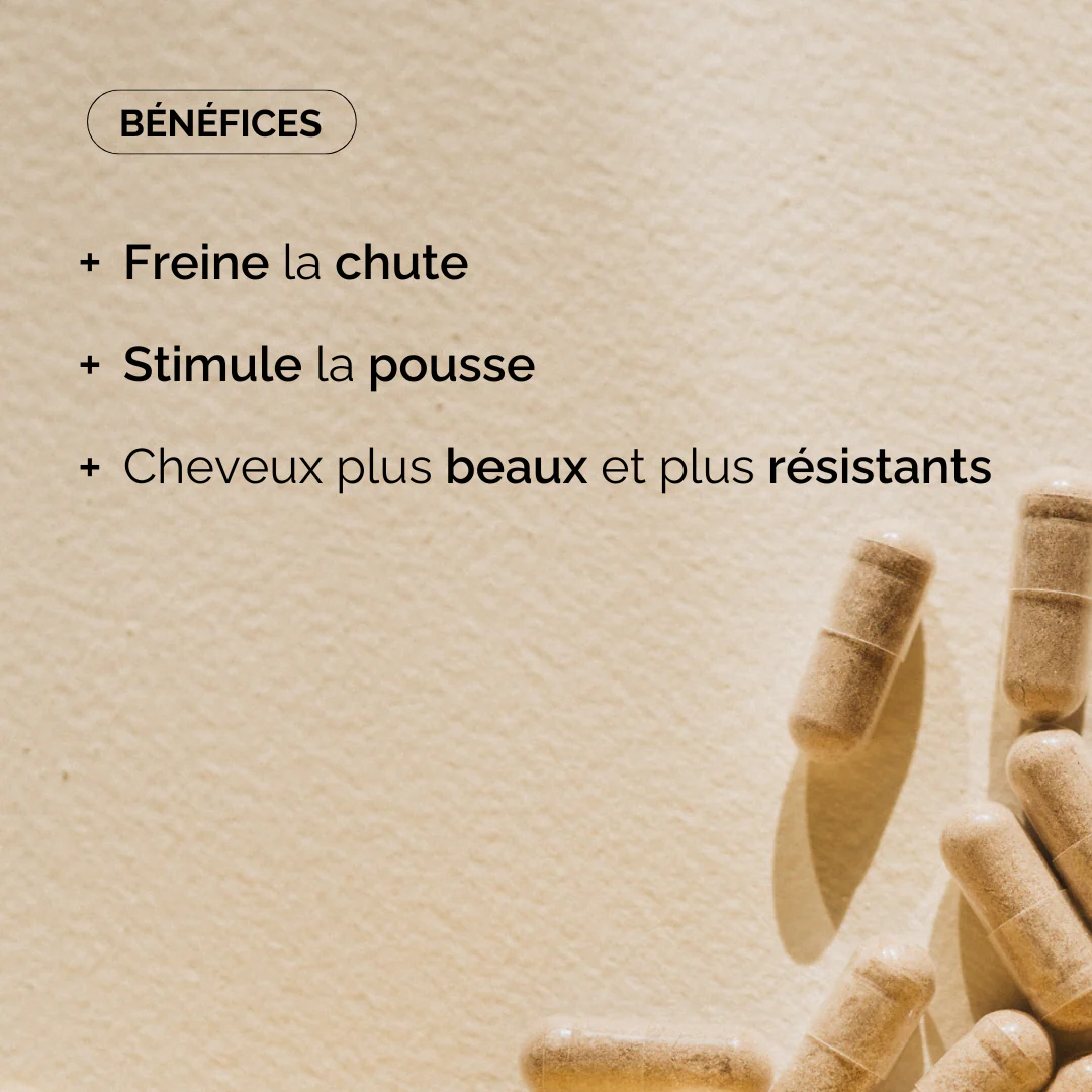 100% d’origine naturelle, à base de roquette, L-arginine, açai, zinc et vitamine B8, voici notre complément alimentaire contre la chute de cheveux. Un cocktail d’actifs puissants pour améliorer la qualité des cheveux et contribuer au maintien d’une chevelure normale, brillante et saine.