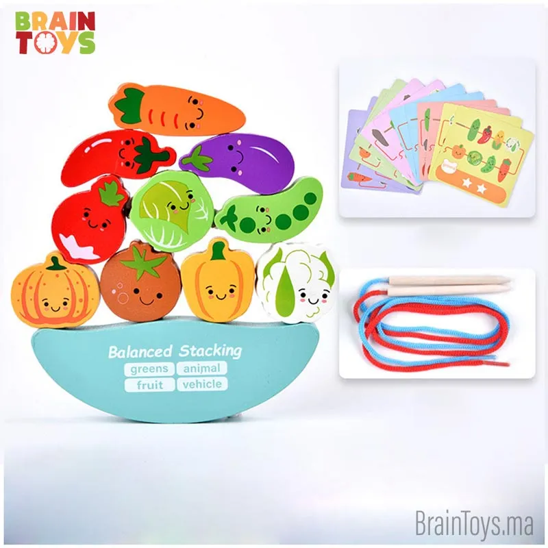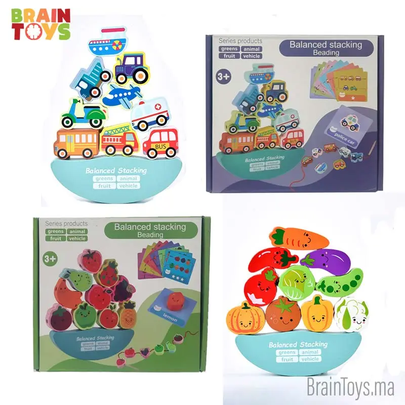 Ils sont constitués de blocs en bois de tailles et de formes variées (véhicule et légumes) qui peuvent être empilés pour créer différentes structures et modèles.