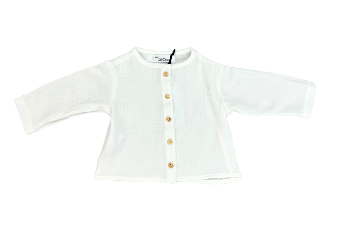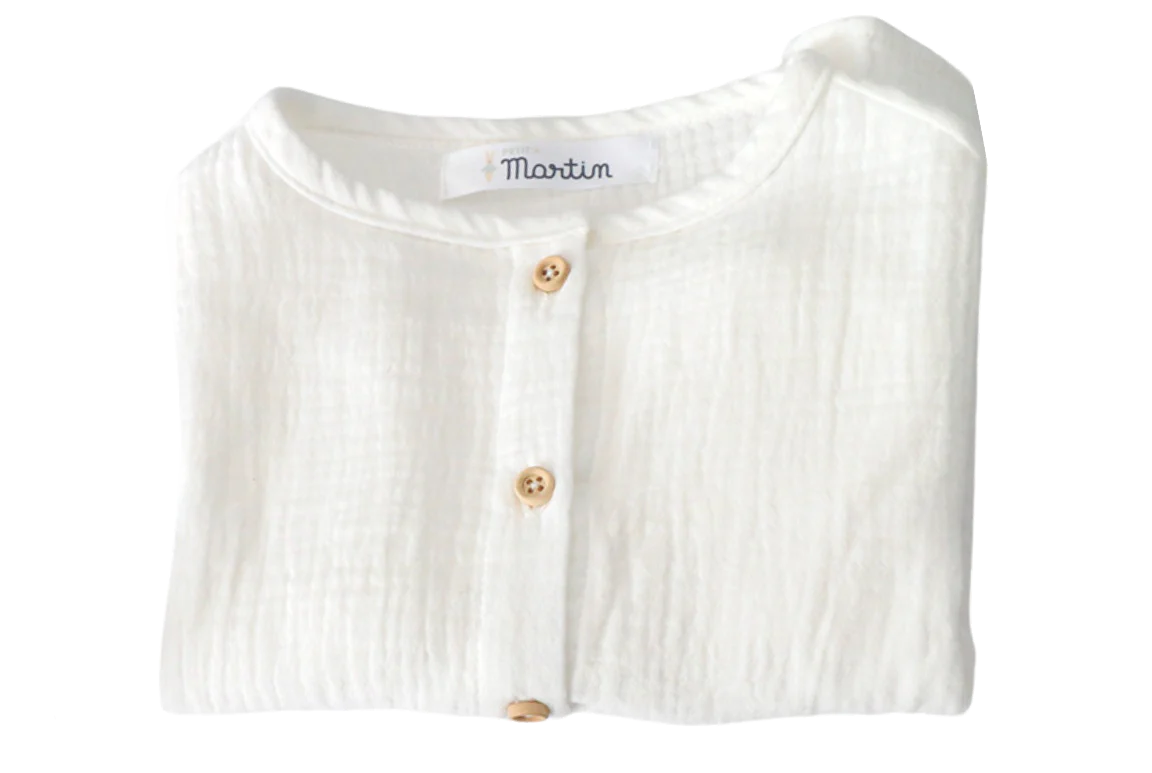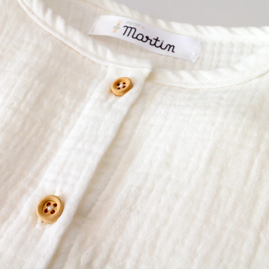 Cette délicate blouse est fabriquée à partir de double gaze de coton, dans une teinte écrue, assurant un confort optimal et ajoutant une touche charmante à la garde-robe de votre bébé.