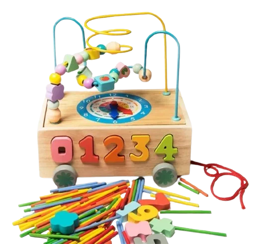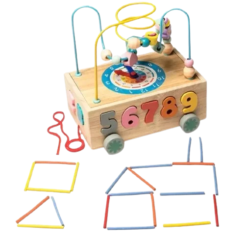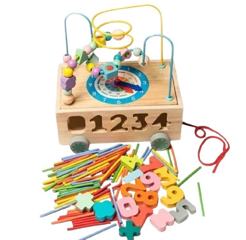 Boîte d’activités en bois 5 en 1 : Voiture à tirer – Labyrinthe à perles – Horloge – Chiffre à encastrer – Bâtonnets en bois