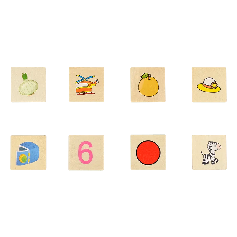 - 80 plaquettes en bois pour la mise en paire: pour chacune des 8 planches correspondent 10 cartes avec des images colorées correspondant à ces images de chaque catégorie sur la carte.