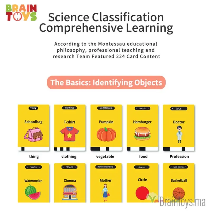 Outre l’apprentissage de l’anglais, ces cartes flash 2 en 1 offrent également d’autres ressources d’apprentissage. Par exemple, un jeu de cartes mémoire peut être inclus, comprenant 112 cartes avec des images de différents sujets tels que la nourriture, les véhicules, les objets du quotidien et les couleurs. Les enfants peuvent s’amuser à jouer à des jeux de mémoire tout en apprenant à reconnaître et à nommer ces objets en anglais.