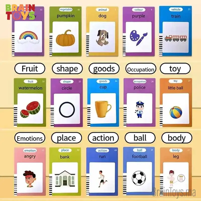Outre l’apprentissage de l’anglais, ces cartes flash 2 en 1 offrent également d’autres ressources d’apprentissage. Par exemple, un jeu de cartes mémoire peut être inclus, comprenant 112 cartes avec des images de différents sujets tels que la nourriture, les véhicules, les objets du quotidien et les couleurs. Les enfants peuvent s’amuser à jouer à des jeux de mémoire tout en apprenant à reconnaître et à nommer ces objets en anglais.