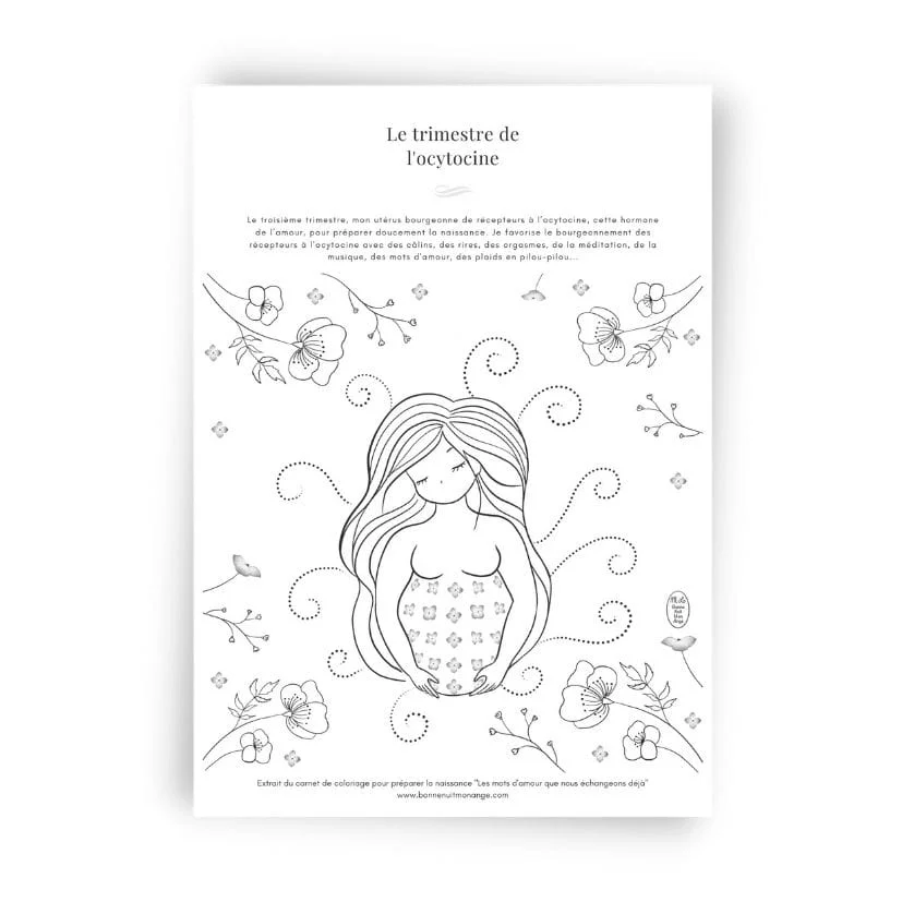 Le troisième trimestre, mon utérus bourgeonne de récepteurs à l’ocytocine, cette hormone de l’amour, pour préparer doucement la naissance. Je favorise le bourgeonnement des récepteurs à l’ocytocine avec des câlins, des rires, des orgasmes, de la méditation, de la musique, des mots d’amour, des plaids en pilou-pilou… Coloriage au format A4 extrait du carnet de coloriage pour préparer la naissance Les mots d’amour que nous échangeons déjà. ******CE PRODUIT EST SOUS FORMAT NUMÉRIQUE******** ♥ Pour l’impression, je vous conseille un papier légèrement plus épais que du papier standard, ce qui vous permettra si vous le souhaitez de colorier à l’aquarelle…