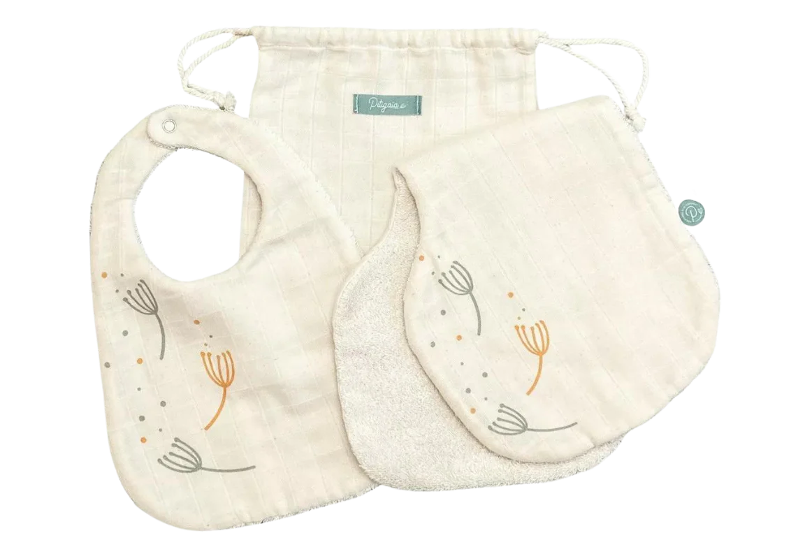 Le duo de bavoirs vous accompagne partout grâce à son sac en lange de coton, protégeant non seulement les vêtements de votre tout-petit mais aussi les vôtres.