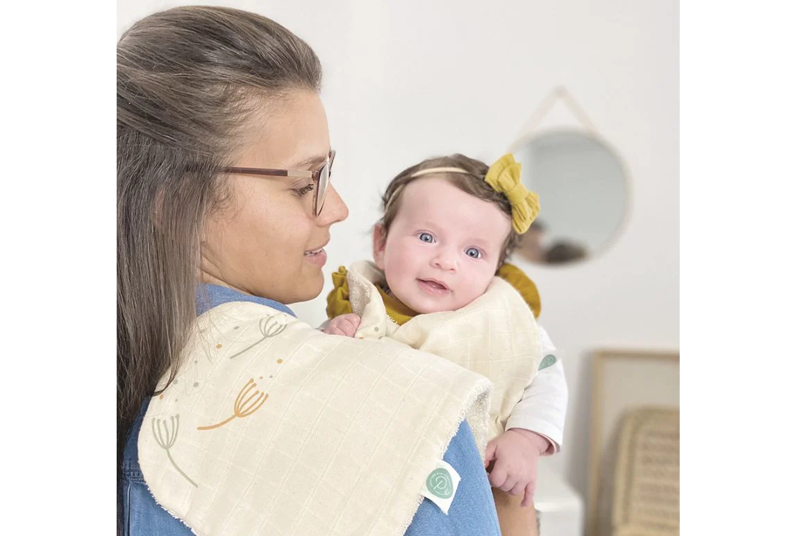 Le duo de bavoirs se compose d’un bavoir pour le bébé et d’un bavoir d’épaule pour l’adulte, tous deux confectionnés à la main à partir de coton biologique.