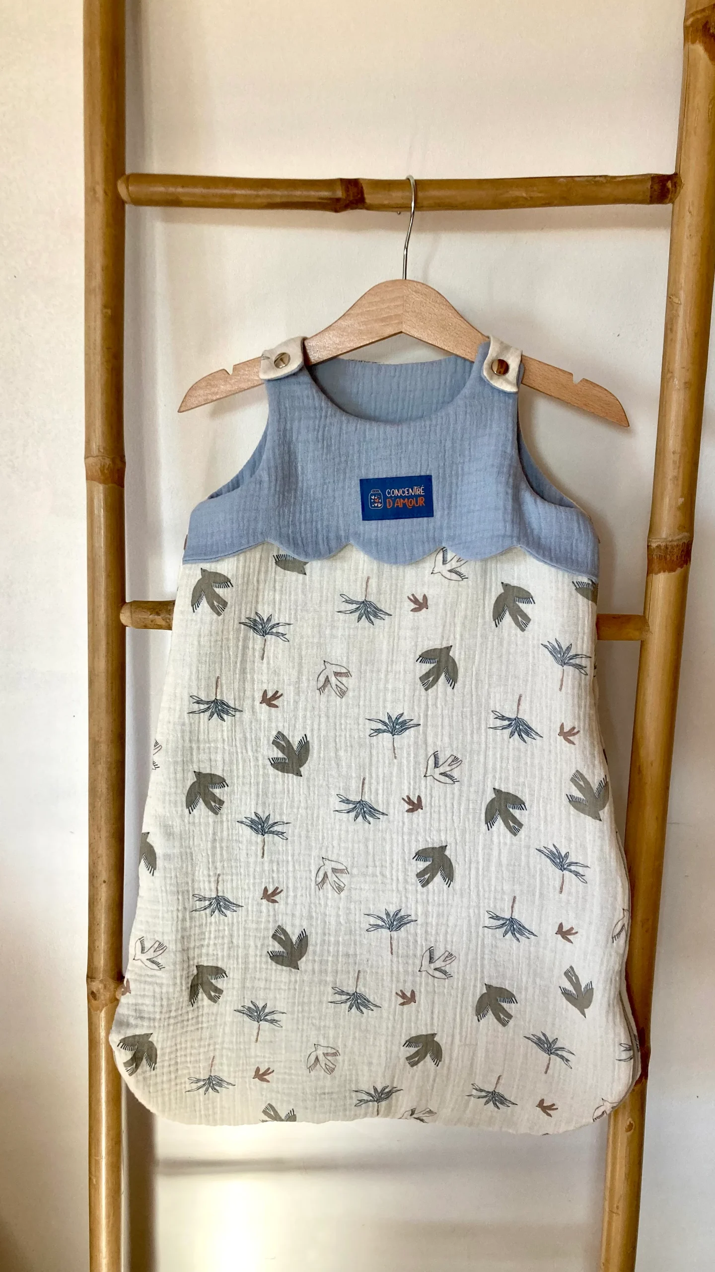 J’ai confectionné la gigoteuse avec le patron Cigogne et la double gaze Oiseaux.