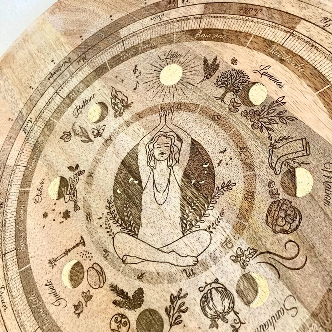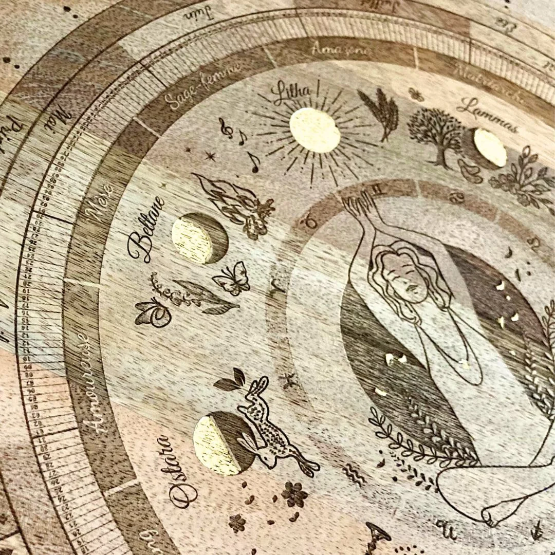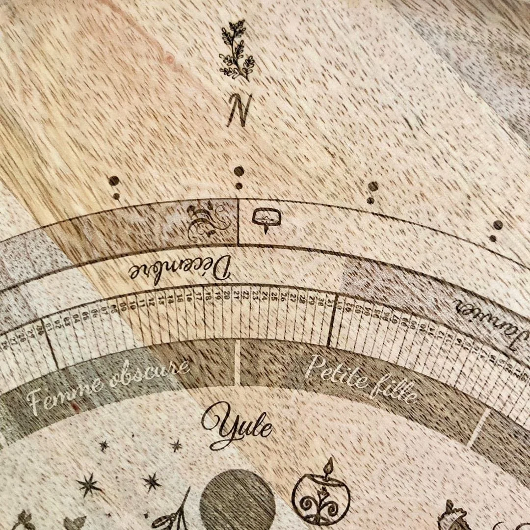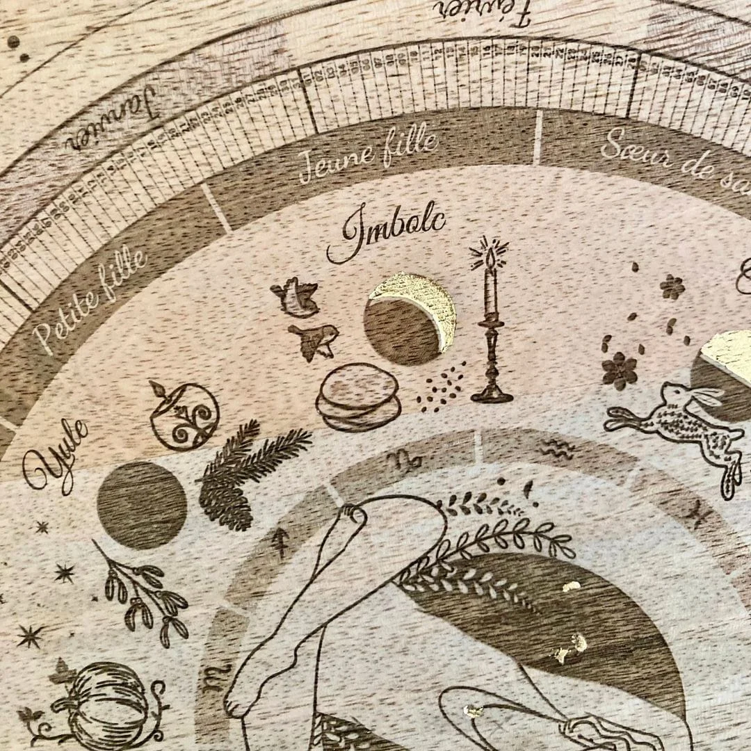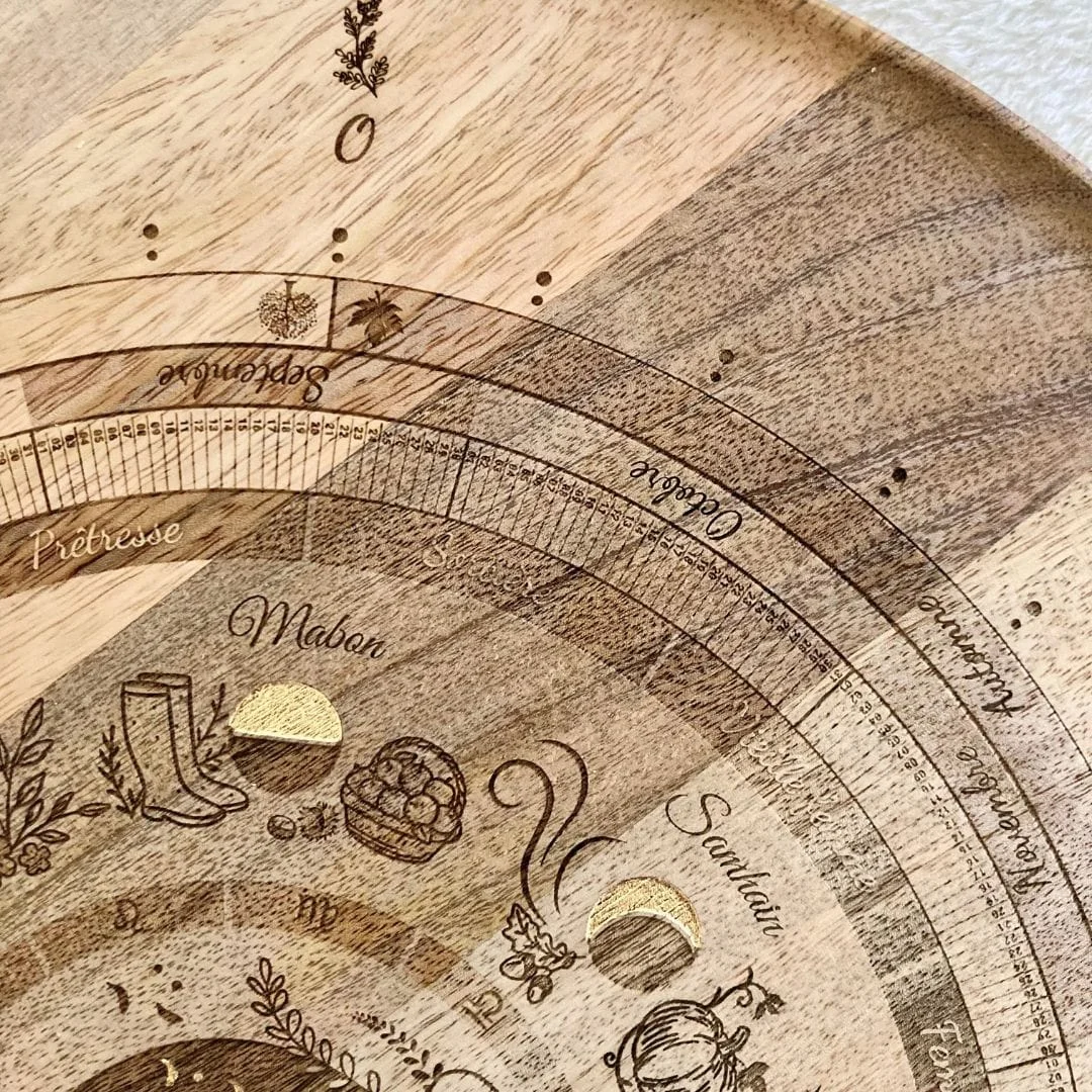 Un très grand plateau en bois doré à la feuille d’or, comme support de transmission des savoirs ancestraux autour du grand cycle de la Vie : Au centre, les signes astrologiques : en astrologie tropicale (celle que nous connaissons toutes et tous, arrêtée en l’an 150 apr. J. -C.) ou en astrologie sidérale (position réelle des constellations aujourd’hui) Les lunes d’or symbolisent le cycle lunaire, mais aussi le temps d’ensoleillement à chaque moment de l’année Les grands moments de l’année, les saisons et les traditions de nos ancêtres qui y sont associées Le rythme de notre planète Terre : les…