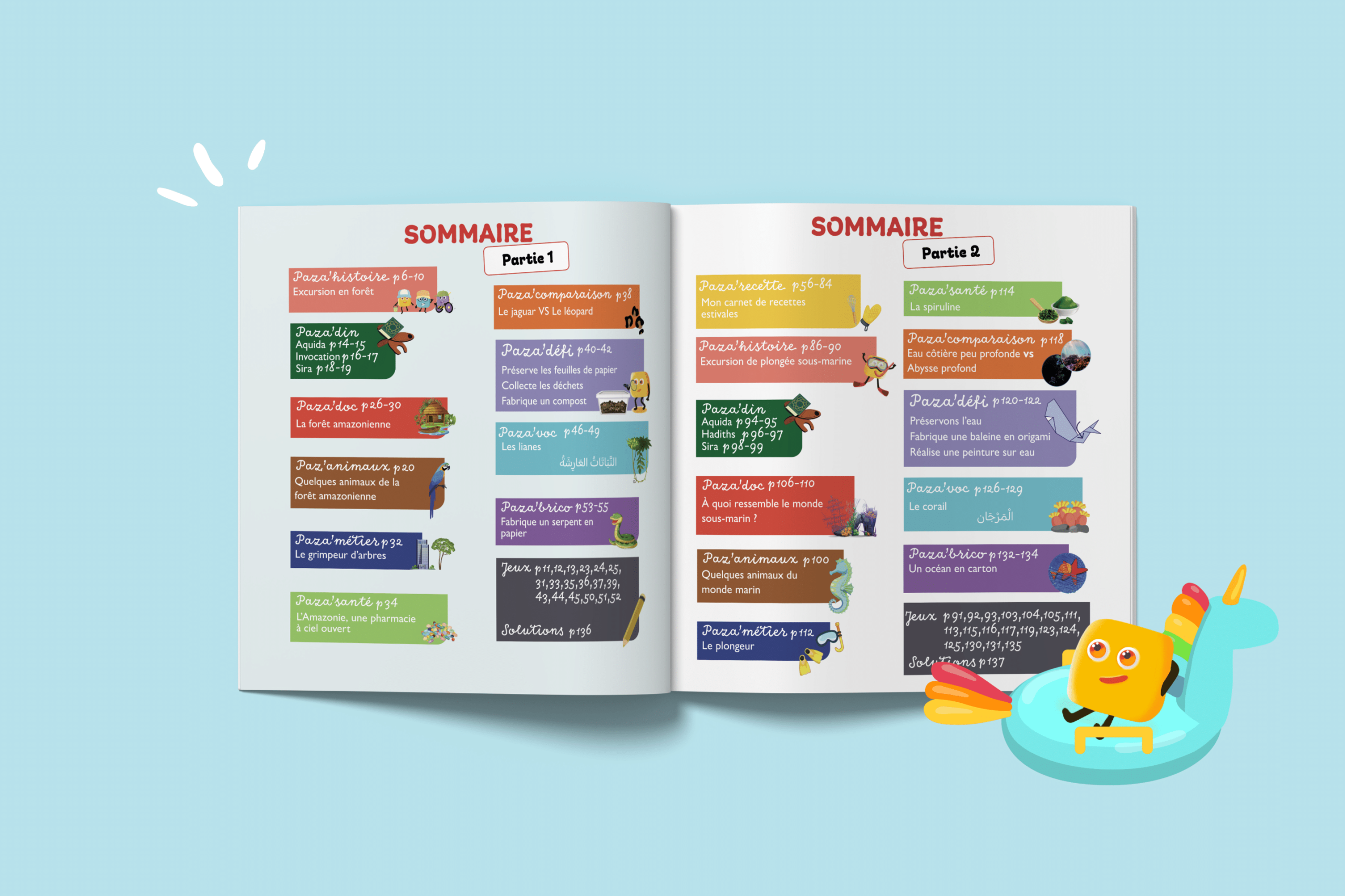 Vous ne savez plus comment faire pour occuper vos enfants pendant les vacances d’été ? Coloriage, peinture, pâte à modeler, jouets… Vous avez vite fait le tour des activités ? Alors ne cherchez pas plus loin : le Paza’Mag spécial été sera votre meilleur allié ! Dans ce numéro spécial, vos enfants vont pouvoir s’occuper en toute sécurité avec : Des histoires captivantes sur les thèmes de la forêt amazonienne et des fonds marin, à lire ou écouter seul ou en famille, en français et en arabe. Des défis et ateliers de bricolage pour challenger et développer les compétences motrices…