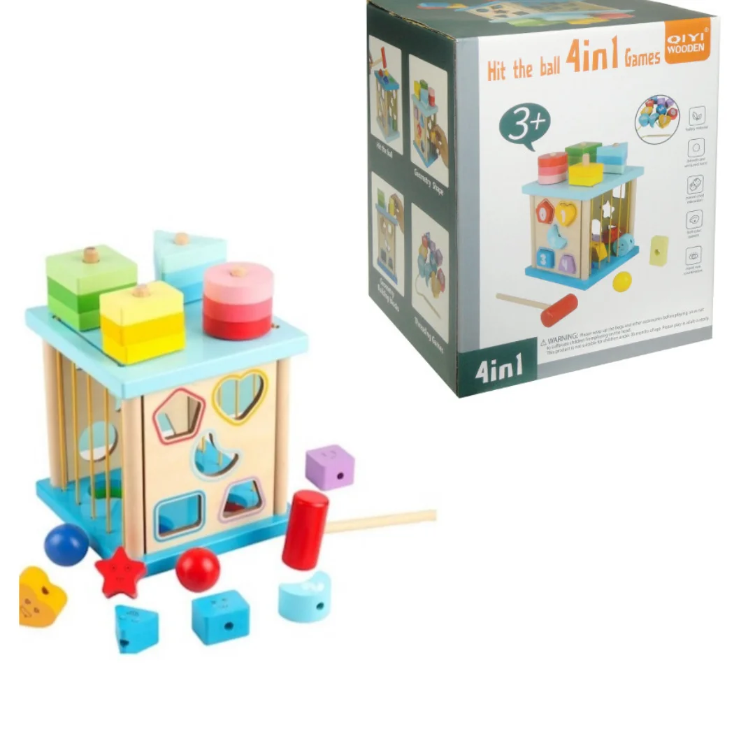 Stimulez l’éveil et les compétences de votre enfant grâce à ce magnifique jeu de formes en bois 4 en 1 : Encastrer – Empiler – Marteler – Enfiler pour éveiller l’intelligence de votre enfant :
