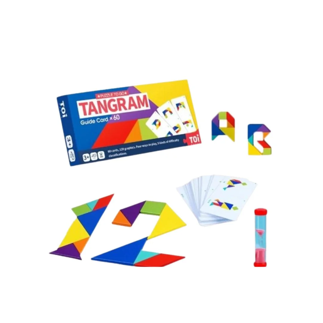 Contenu : 7 pièces de Tangram, 60 cartes modèles, 1 sablier, guide