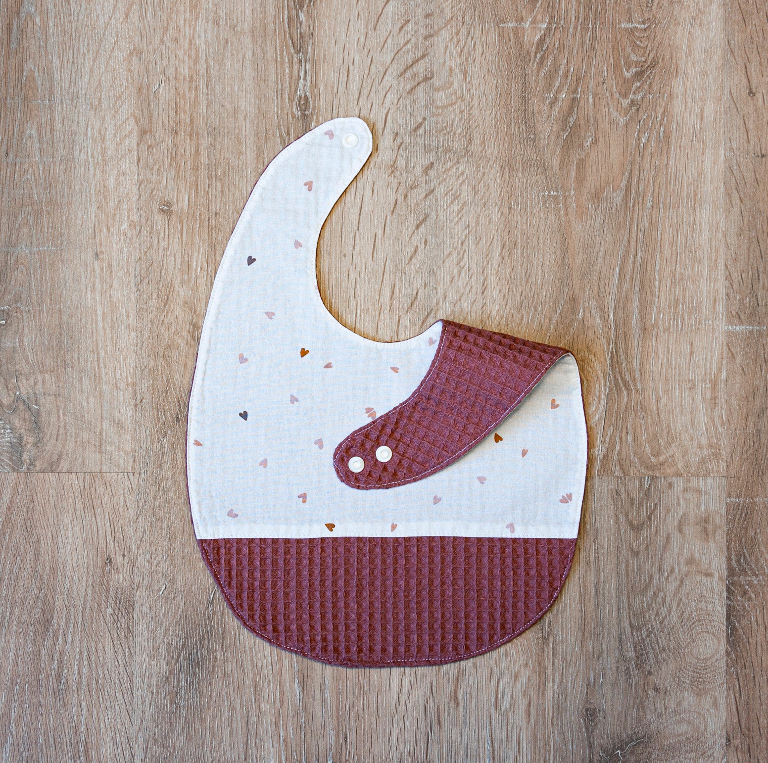 Vous pourrez réaliser l’avant du bavoir tout en tissu à motifs ou en mixant avec le tissu nid d’abeille en bas du bavoir (pratique pour essuyer la bouche de bébé). L’envers du bavoir sera confectionné en nid d’abeille.