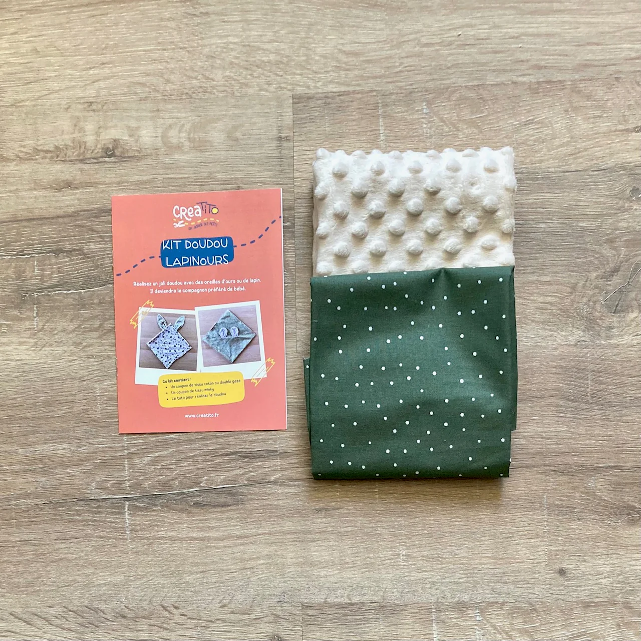 Ce kit vous permet de réaliser le doudou Papatte qui accompagnera bébé partout. Aves ses tissus tout doux et ses nœuds aux pattes, il éveillera aussi ses sens.