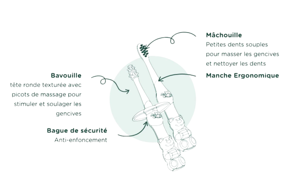 Ce kit se compose de deux brosses complémentaires, nommées « Bavouille » et « Mâchouille », et d’une bague de sécurité, spécialement conçues pour la poussée dentaire des bébés.