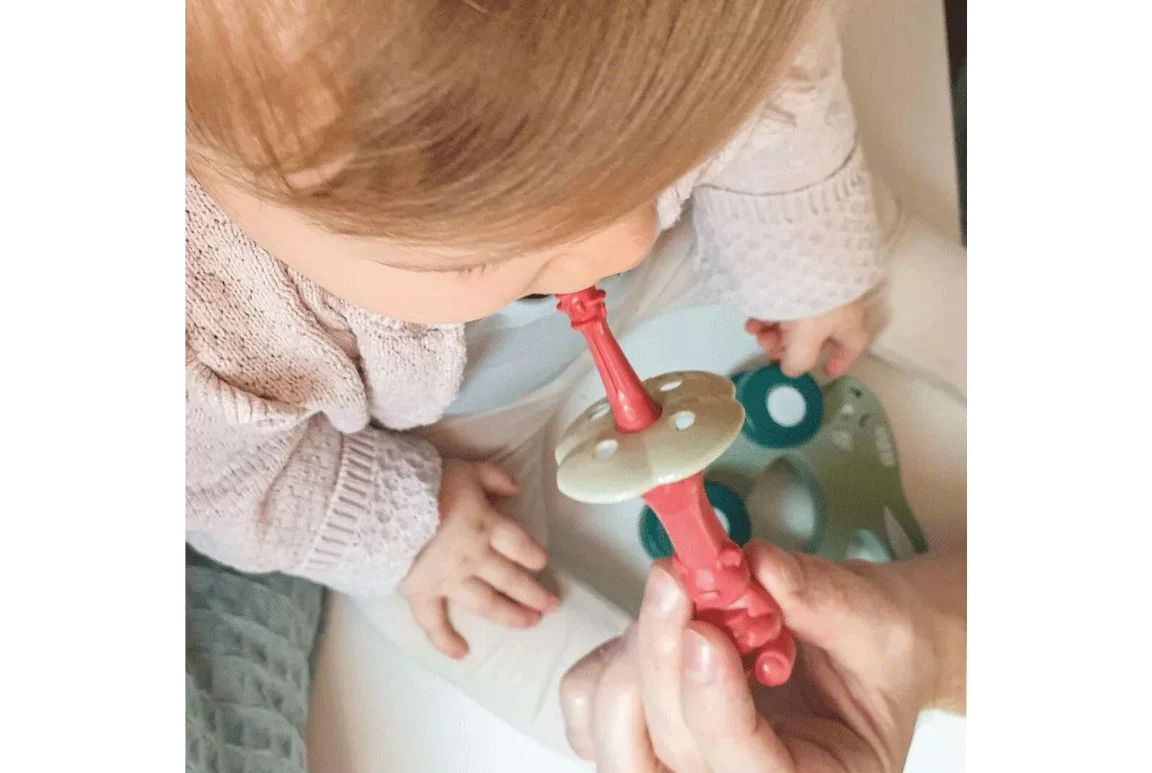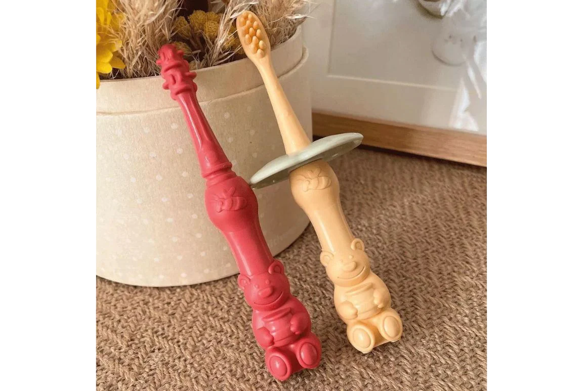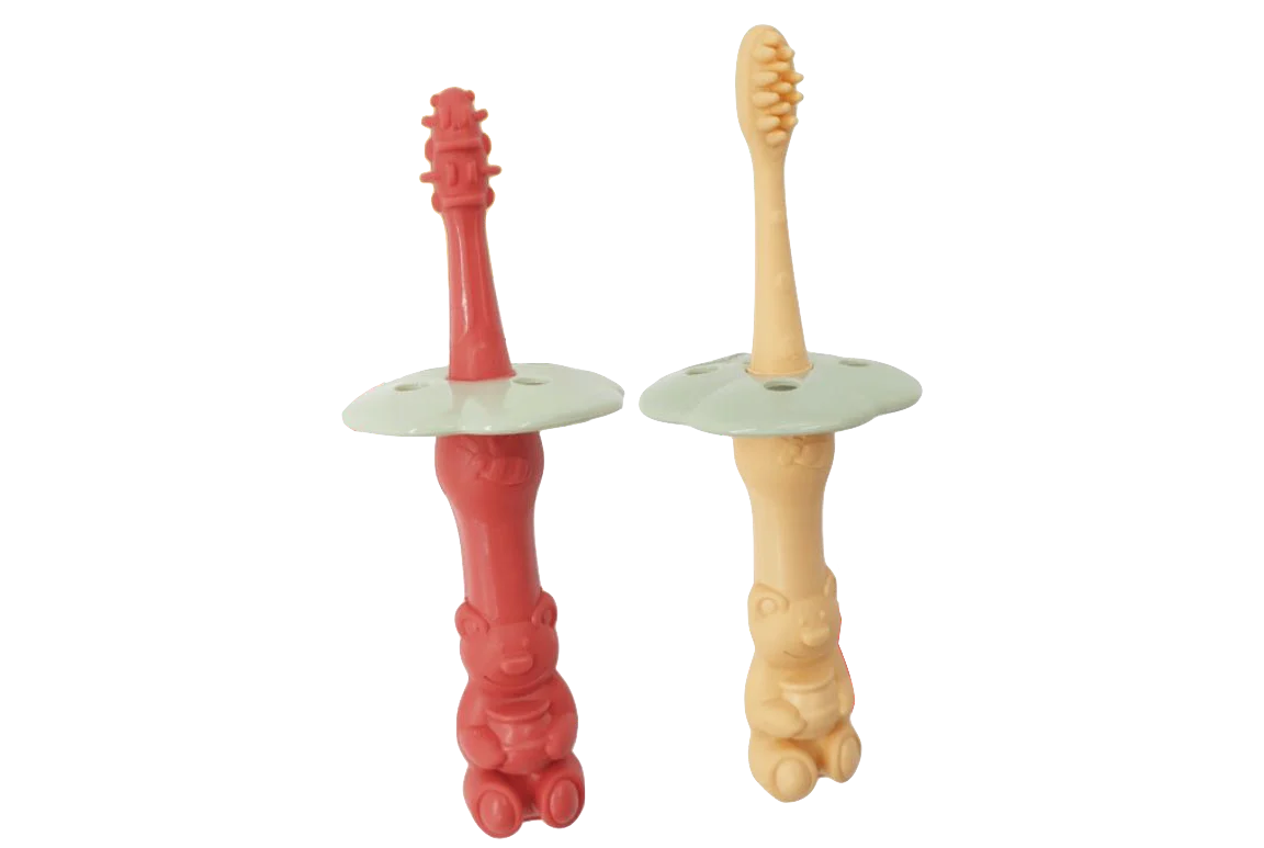 Les couleurs vives des brosses sont adaptées à la vision des bébés, et la forme d’ours du manche renforce leur motricité fine; c’est à la fois ludique et ergonomique.