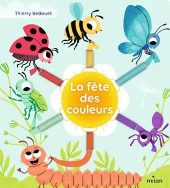 Petite coccinelle rouge a l’air bien pressée, abeille jaune installe des lampions, les petites fourmis violettes se hâtent avec un gâteau… Mais que préparent les petites bêtes ? Mais oui, c’est une fête ! Une fête de toutes les couleurs !