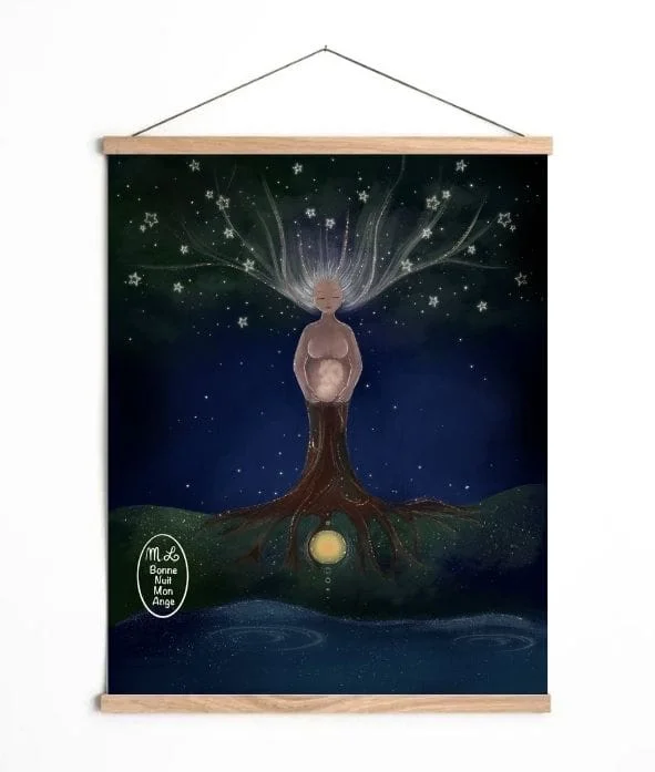 L’arbre Mère aux lucioles ✨ L’énergie de la Mère qui enfante Les racines profondément ancrées jusqu’au coeur de la Terre Et les branches élancées vers le ciel et ses étoiles Reliée à son bébé dans son âme, sa chair et tout son amour Elle lui chuchote : “Viens, mon bébé… Je suis prête” Tirage signé à la main au verso, imprimé en France avec amour sur papier d’art 324 g/m² Toile très grand format 80 x 60 cm à texture fine, tendue sur un cadre en bois fabriqué à la main. Encres sans aucun solvant et résistantes aux UV.