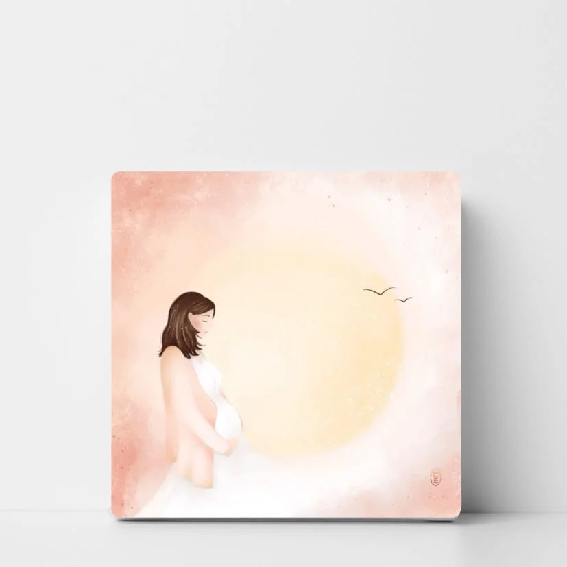 L’attente Un doux mélange de confiance, d’impatience, d’appréhension, de lâcher-prise… et d’amour. Toile grand format 60 x 60 cm à texture fine, tendue sur un cadre en bois fabriqué à la main. Encres sans aucun solvant et résistantes aux UV.