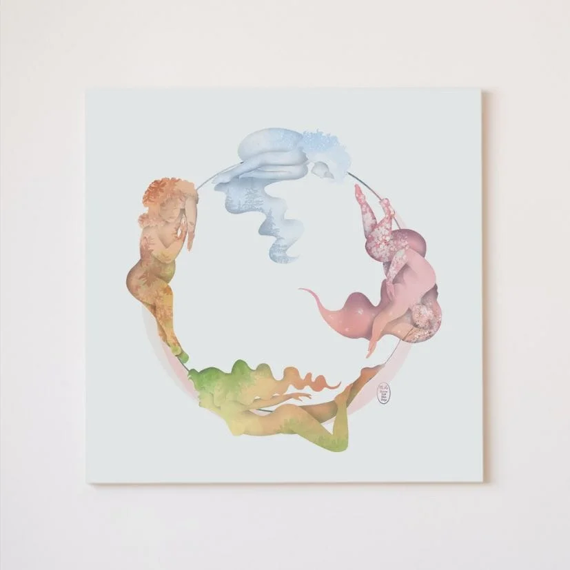 Une ode au cycle féminin, à ses phases, à la danse des hormones et du corps de la Femme. Une présentation tout en douceur et en poésie de la croissance et décroissance des hormones (oestrogènes, progestérone), des besoins essentiels à chaque phase, et des saisons intérieures : le printemps pour la phase pré-ovulatoire l’été pour l’ovulation l’automne pour la phase post-ovulatoire l’hiver pour les menstruations Impression sur toile 60 x 60 cm à texture fine, tendue sur un cadre en bois fabriqué à la main. Encres sans aucun solvant et résistantes aux UV.