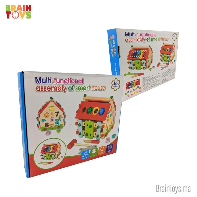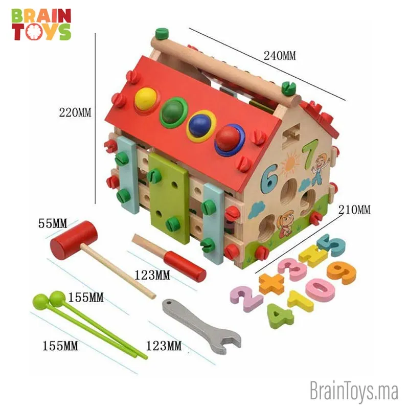 Maisonnette educative en bois Multifonctionnel, Montessori– Cet ensemble de jouets multifonctionnels combine 6 jeux en un : jouer au xylophone, marteler, associer des formes, identifier des chiffres, maîtriser des compétences mathématiques et simuler des scènes de vie.