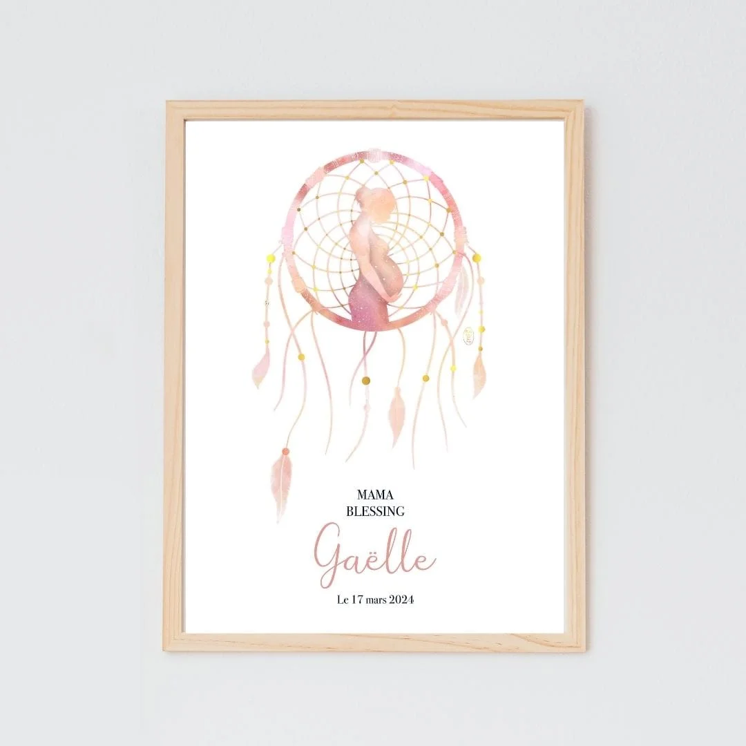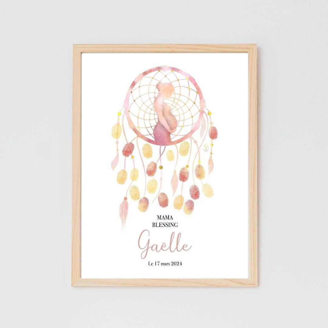 Un attrape-rêve à empreintes sur lequel chaque participante du Mama Blessing viendra laisser une ou plusieurs empreintes. C’est à la fois un joli rituel et un souvenir inoubliable pour soutenir et entourer la future maman jusqu’à la naissance… et bien après. Vous avez plusieurs options pour cette affiche : Affiche personnalisée à télécharger sous 48 heures : vous m’indiquez le prénom et la date lors de la validation de votre commande, et je vous envoie l’affiche personnalisée par email sous 48 heures. Vous recevrez l’affiche au format JPEG. Il ne vous restera plus qu’à l’imprimer au format A4 ou A3, chez…