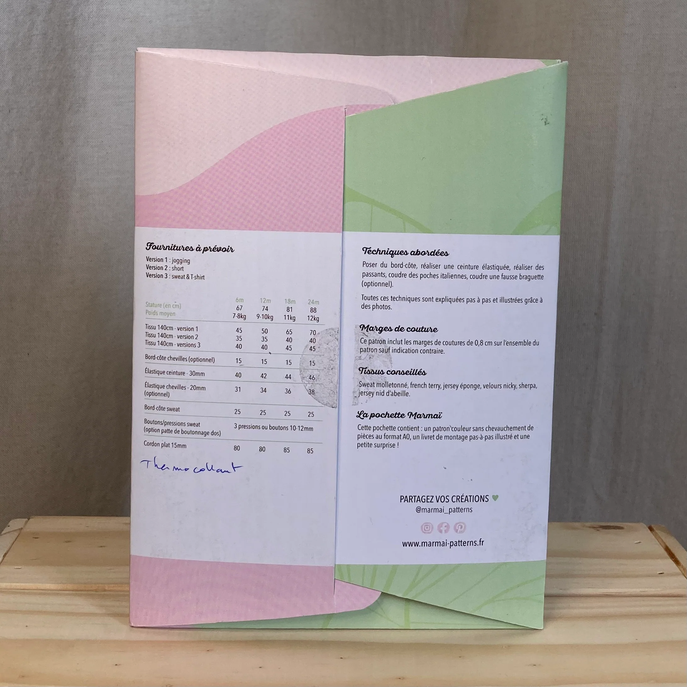 La pochette comprends un livret avec les explications pas à pas illustrées de photos, le patron à taille réelle en couleur (les différentes pièces ne se superposent pas) et une surprise.