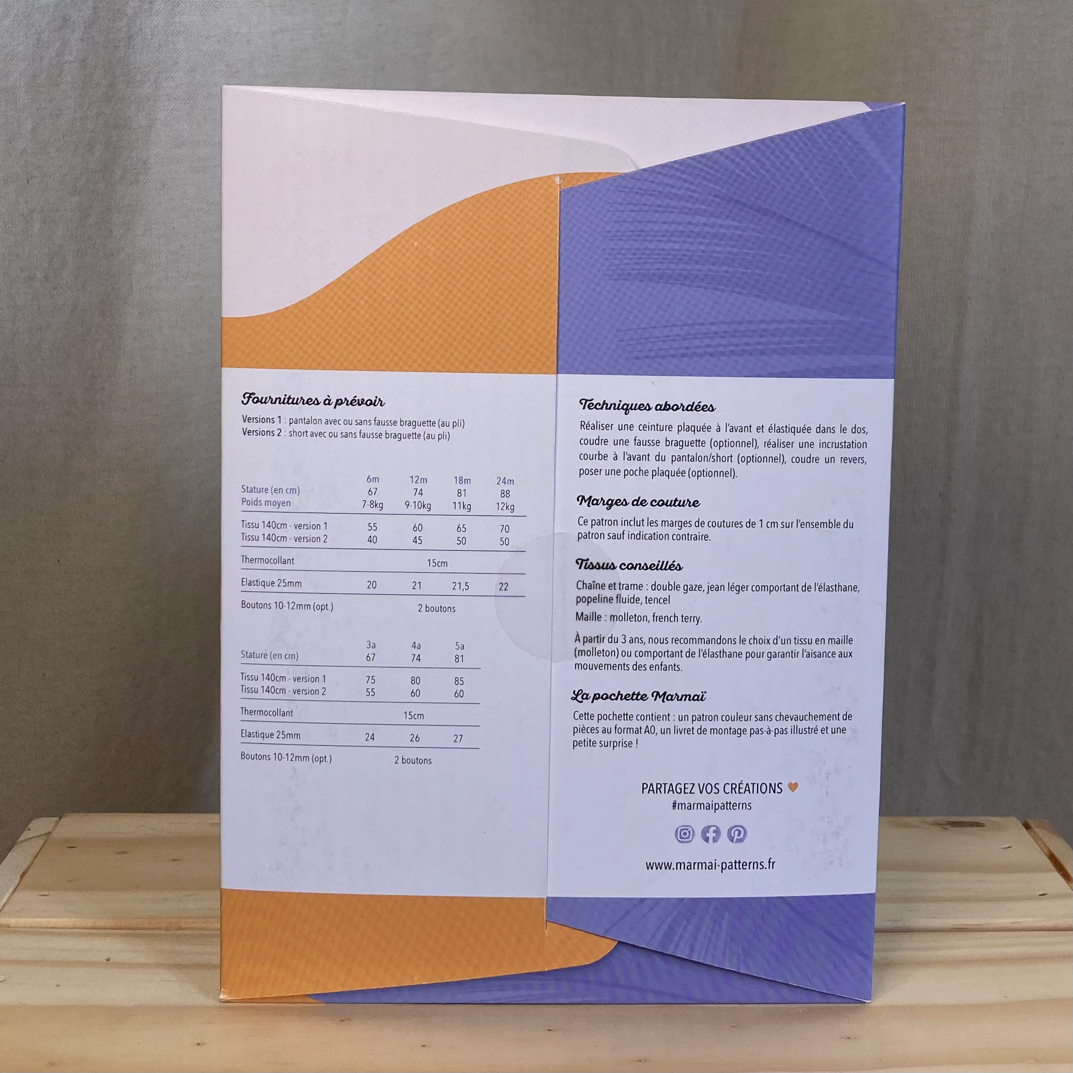 La pochette comprends un livret avec les explications pas à pas illustrées de photos, le patron à taille réelle en couleur (les différentes pièces ne se superposent pas) et une surprise.