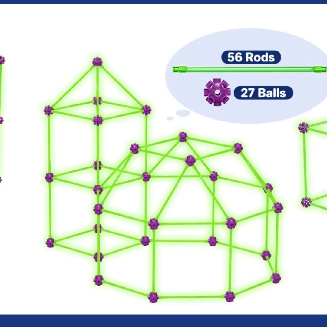 Le kit inclut des bâtons de construction phosphorescents qui brillent dans l’obscurité. Une fois exposés à la lumière du soleil pendant 15 à 30 minutes, ils émettent une lumière magique la nuit. Les enfants pourront ainsi créer des forts lumineux et jouer à des jeux imaginatifs.