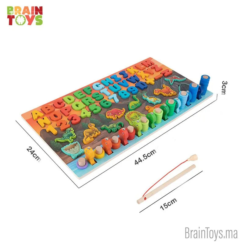 Design parfait : canne à pêche en bois, une variété de couleurs, chiffres et lettres pour correspondre aux chiffres et lettres des petits animaux