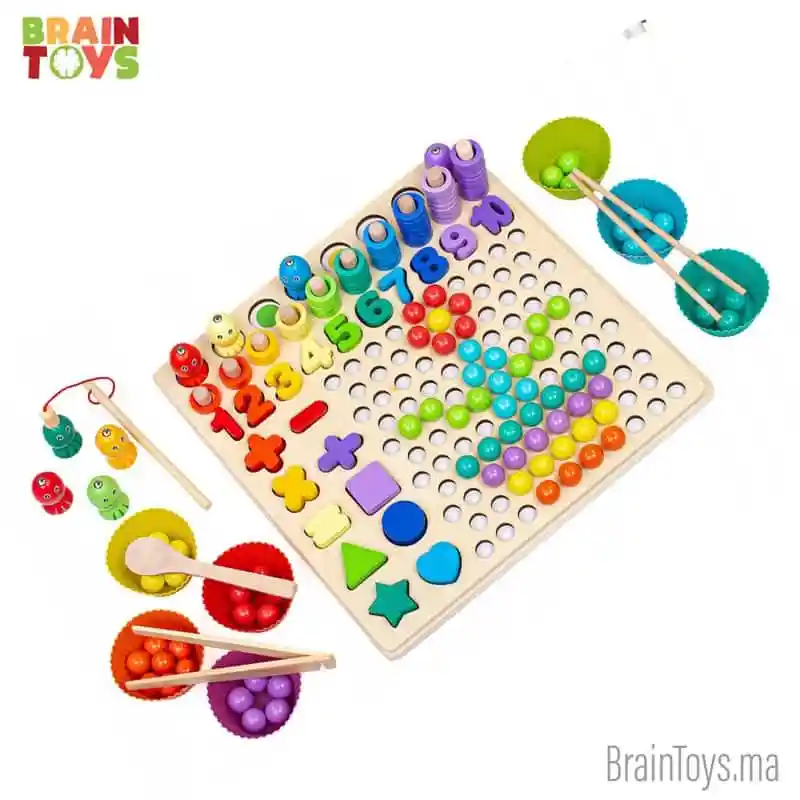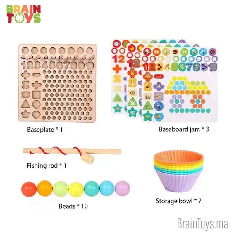 Plateau Montessori Educatif, Plaque logarithmique avec perles1: Le tableau de puzzle logarithmique 13 en 1 pour enfants offre plusieurs jeux amusants, notamment une plaque inférieure, des cartons, une canne à pêche, une baguette, une cuillère, une pince, des perles, des bols, un bloc de symboles mathématiques, etc.