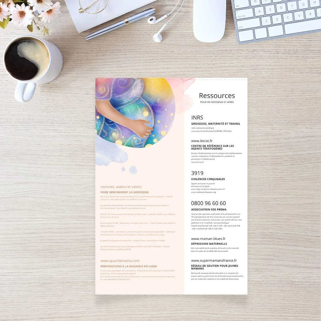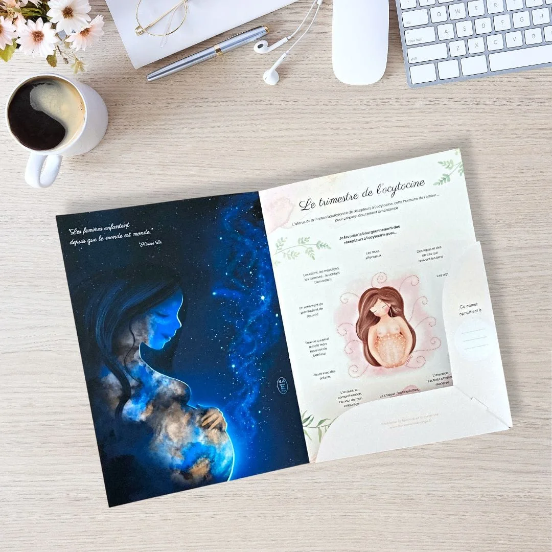 Naître Mère, et honorer le miracle qui s’opère : je porte la vie ! Pochette à rabat avec une touche de poésie, de magie et d’amour pour conserver tous les documents de suivi de grossesse : ordonnances, comptes-rendus d’échographie, résultats d’analyse, … La pochette est composée de deux illustrations en pleine page pour enchanter la maternité, une page mémo sur le trimestre de l’ocytocine, une liste de numéros utiles et de précieuses références choisies pour préparer la naissance de votre bébé. Format A4 en papier cartonné épais 350g/m2, conçue et imprimée en France avec amour