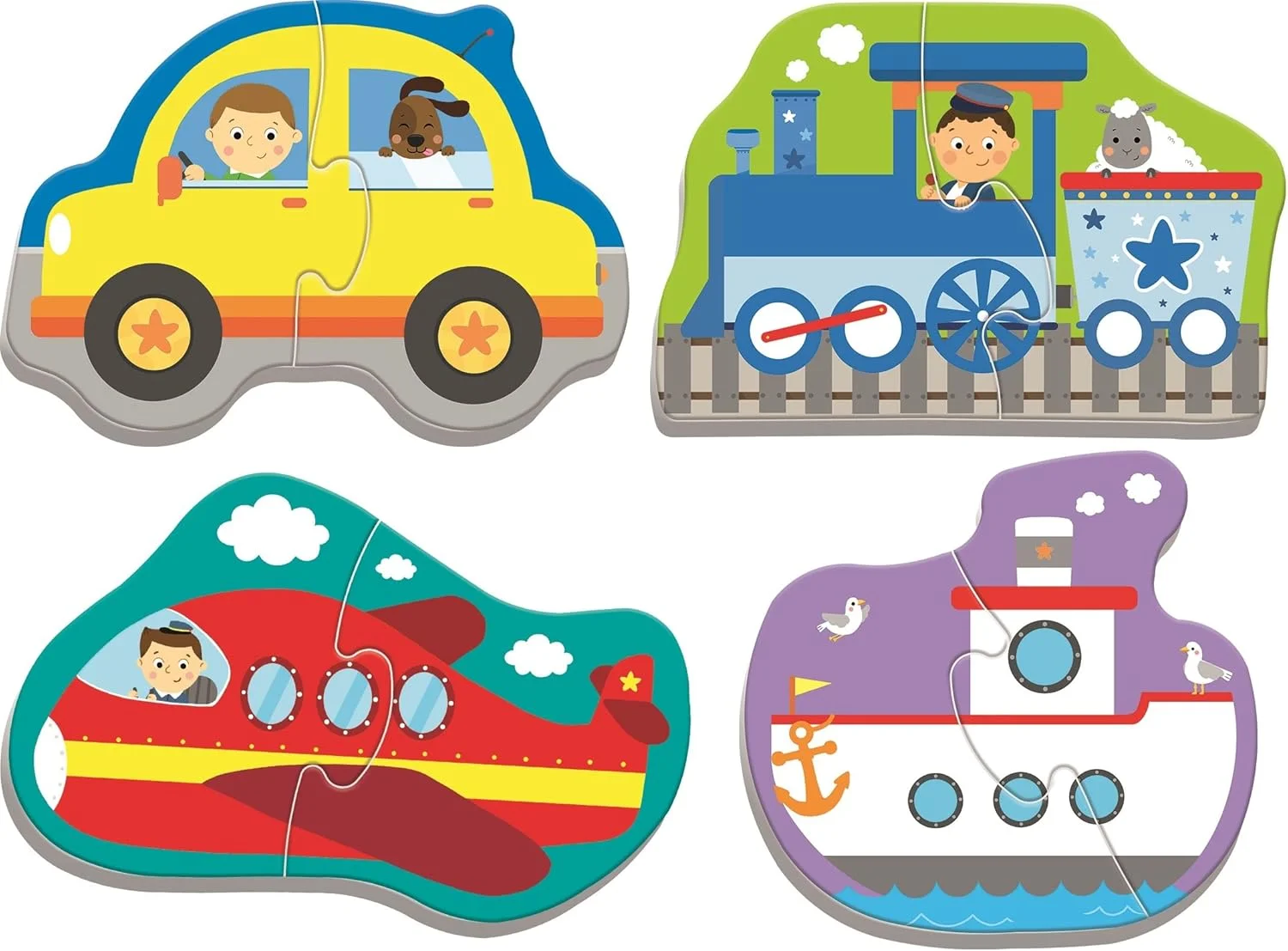 4 puzzles (avion, voiture, bateau, camion)