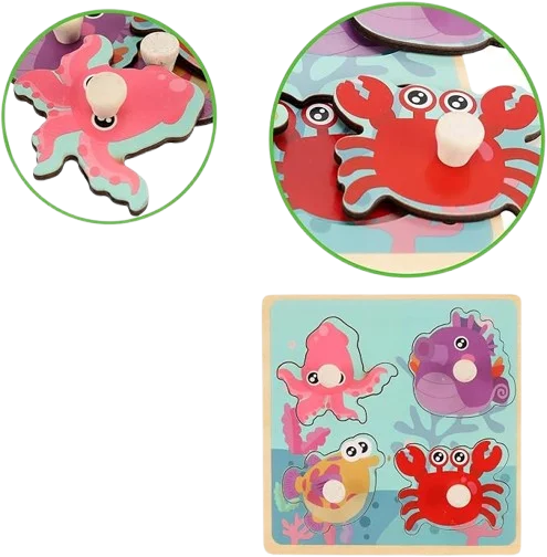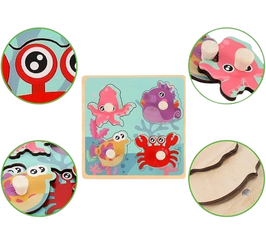 Puzzle à Boutons en Bois 4 animaux marins pour Bébé 12 mois