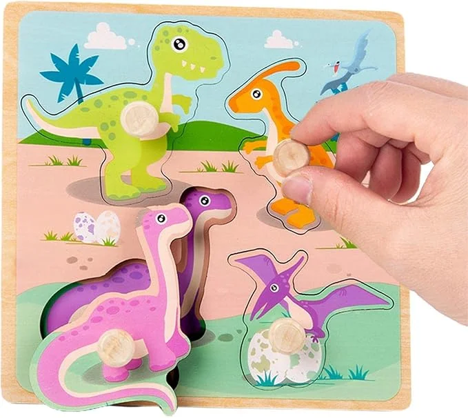 Puzzle à Boutons en Bois 4 Dinosaures pour Bébé 12 mois