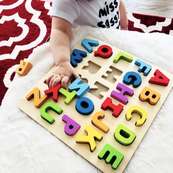 Un jeu éducatif qui apprend aux enfants à reconnaître les lettres et à les placer correctement sur la planche en bois.