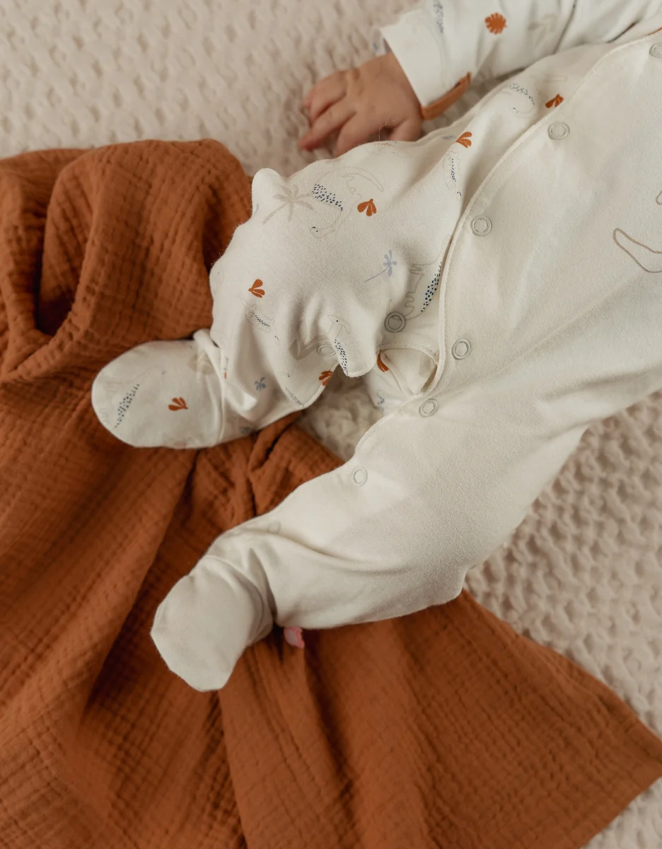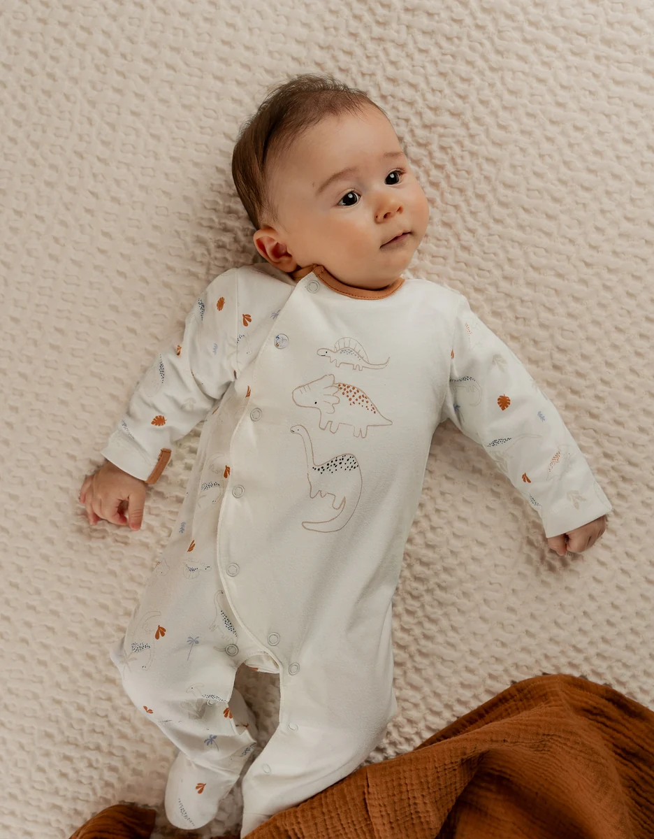 Imaginez un monde où trois dinosaures se baladent joyeusement sur un tissu de jersey doux comme un câlin ! Ajoutez à cela une petite touche personnalisée avec une pression unique et une bordure en biais ocre pour une finition pleine de style. Les aventures commencent dès que bébé enfilera ce vêtement ! 🦕✨ » Avantages : Respirabilité: Le jersey, un tissu respirant, contribue à maintenir la température corporelle de bébé stable pendant la nuit. Cela lui permet de rester confortable même lors de nuits plus chaudes ou pendant les saisons intermédiaires. Ouverture par l’avant: Les boutons pression situés à l’avant du pyjama évitent de devoir retourner bébé pour fermer le pyjama, ce qui rend le processus simple pour les parents. Gousset à l’entrejambe: La présence d’un gousset à l’entrejambe assure une liberté de mouvement maximale à bébé tout en maintenant le pyjama bien en place. Élastique aux chevilles: Les élastiques aux chevilles assurent que les pieds de bébé restent bien en place dans le pyjama, évitant ainsi « l’effet grenouille ». Anti-dérapants dès la taille 9M: Pour les petits qui commencent à découvrir la marche, des motifs anti-dérapants sont présents dès la taille 9 mois, offrant une meilleure adhérence et sécurité. Attache doudou: Une attache doudou sur la manche permet à bébé de garder son doudou préféré à portée de main, réduisant ainsi le risque de perte ou d’égarement.