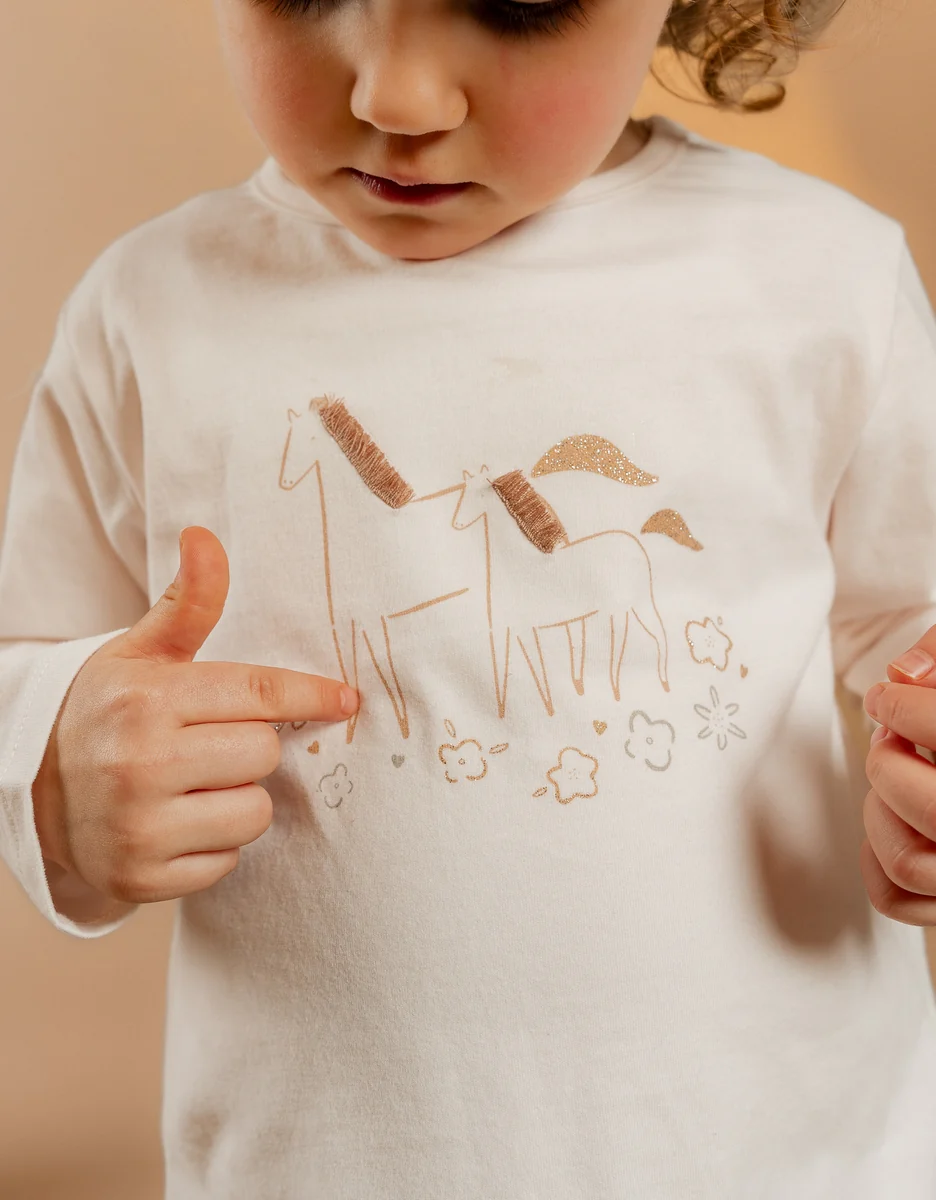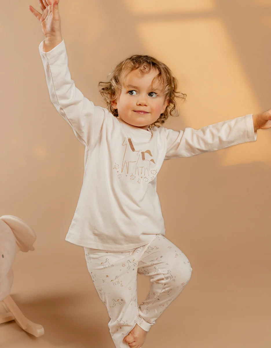 Découvrez la délicatesse de ce pyjama : créé dans un jersey finement imprimé, dévoilant un couple de poneys avec une crinière en relief. Une invitation à rêver pour les petites filles ! Avantages : Facilité d’habillage: Pour la taille18mois, des pressions à l’épaule permettent d’ouvrir largement le col du pyjama, facilitant ainsi l’enfilage de la tête de l’enfant. Autonomie de l’enfant: La taille élastiquée permet à l’enfant d’enfiler et de retirer le pantalon tout seul, tout en s’adaptant à sa morphologie. Respirabilité: Le jersey, un tissu respirant, contribue à maintenir la température corporelle de l’enfant stable pendant la nuit. Multi-saisons: Le pyjama, avec ses manches et jambes longues est parfait pour être porté à la mi-saison, voire même en plein hiver si vous prévoyez une gigoteuse ou une couverture adaptée à la température de la chambre.