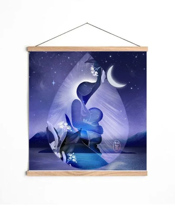 Une ode à toutes les mères qui allaitent leurs bébé la nuit Qui prennent leur enfant tout contre elles, Toutes engourdies de sommeil L’apaisent, le caressent, chuchotent “Je suis là, mon tout petit… je suis là” Soupir. Sourire… Mère et enfant oscillent encore quelques secondes Au bord de la réalité du lit, de la chambre, de la nuit Puis rejoignent doucement, sans même s’en rendre compte Le rivage de leurs rêves. Impression en France avec amour sur papier d’art 324 g/m² Signature à la main au verso