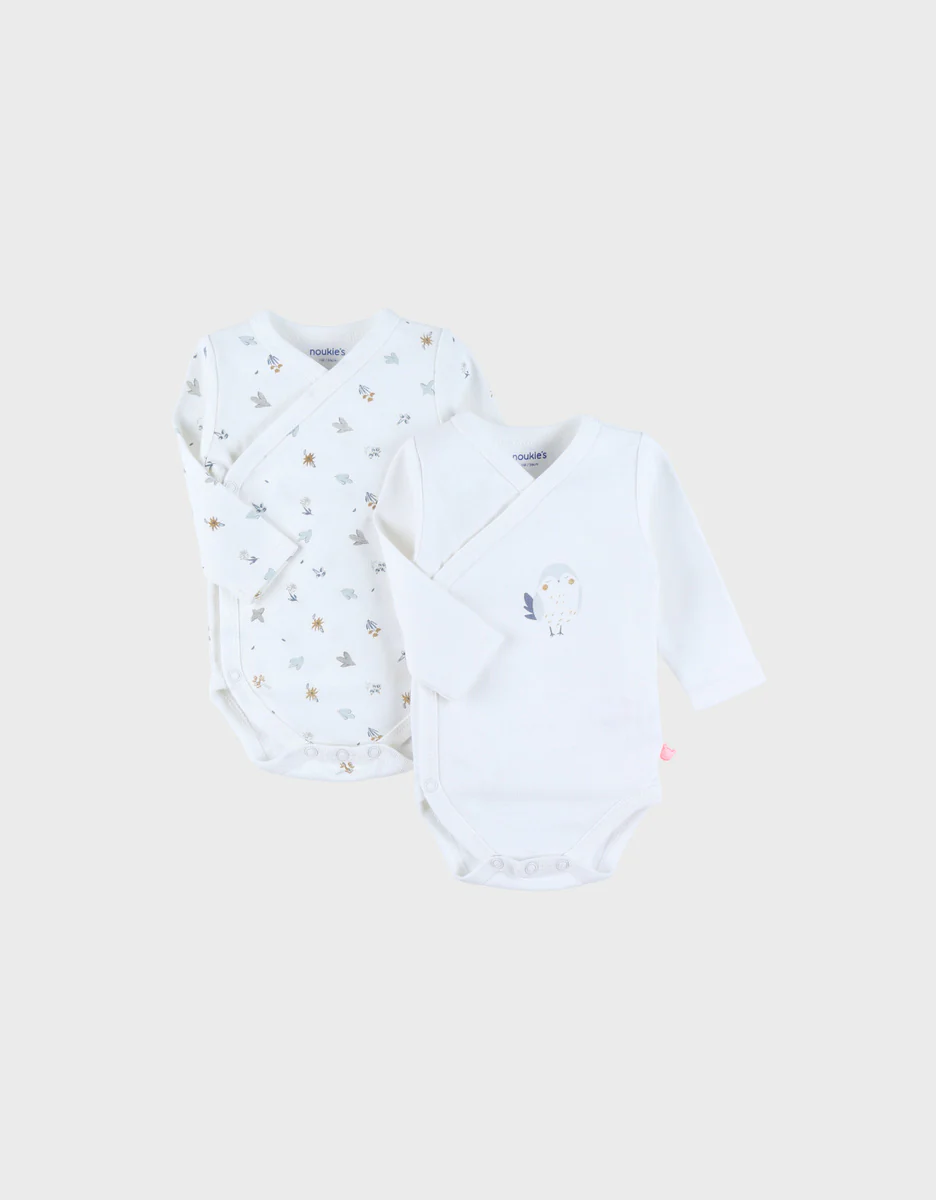 Ce lot de deux bodies à manches longues, en jersey de coton doux certifié Oeko-Tex, sont parfaits pour respecter la peau délicate de bébé. Leur ouverture croisée sur le devant facilite l’habillage au quotidien.