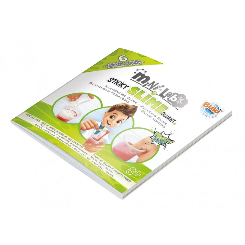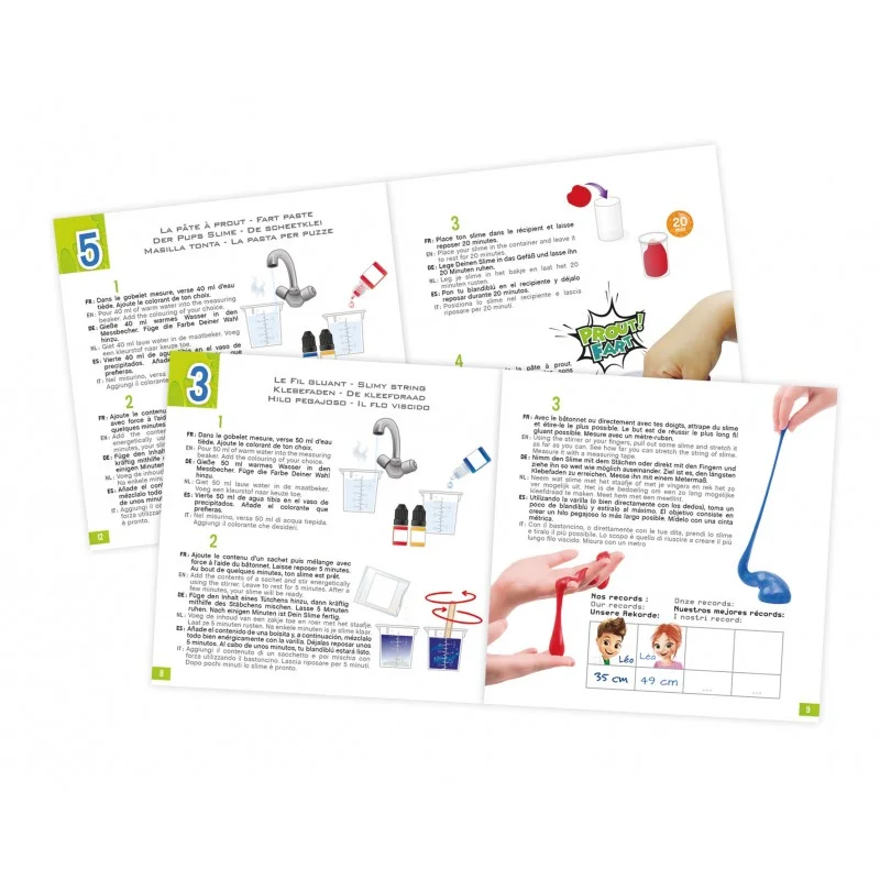 Contenu: poudre à Slime gluant (6 sachets de 4g – 24 g), peinture (bleu, rouge et jaune), paillettes, gobelet mesure, bâtonnet, récipients, notice illustrée en couleurs.