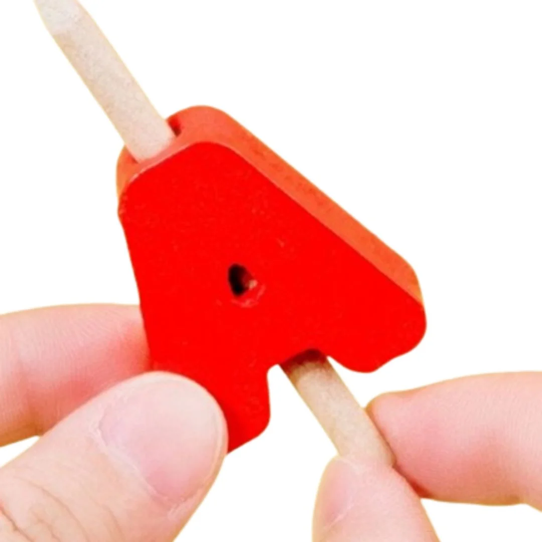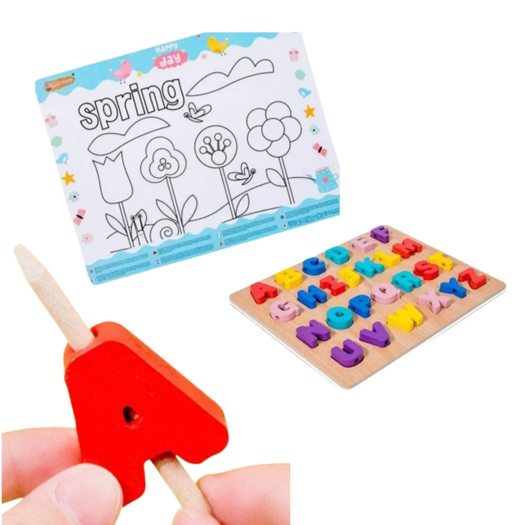 - Nombre de pièces : 26 lettres majuscules, tableau d’écriture, feutres, et un fil pour l’enfilage.
