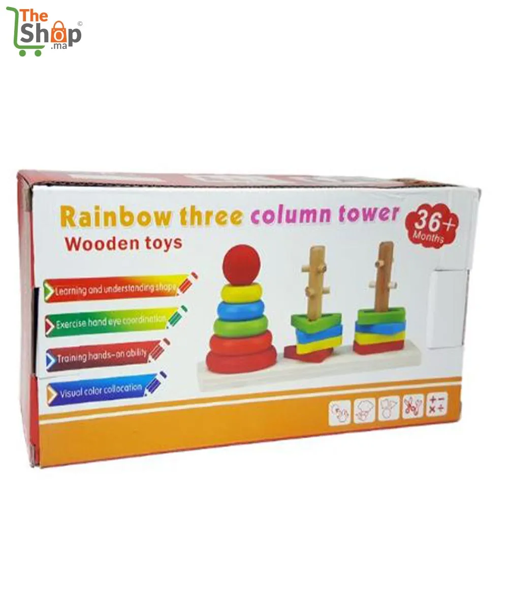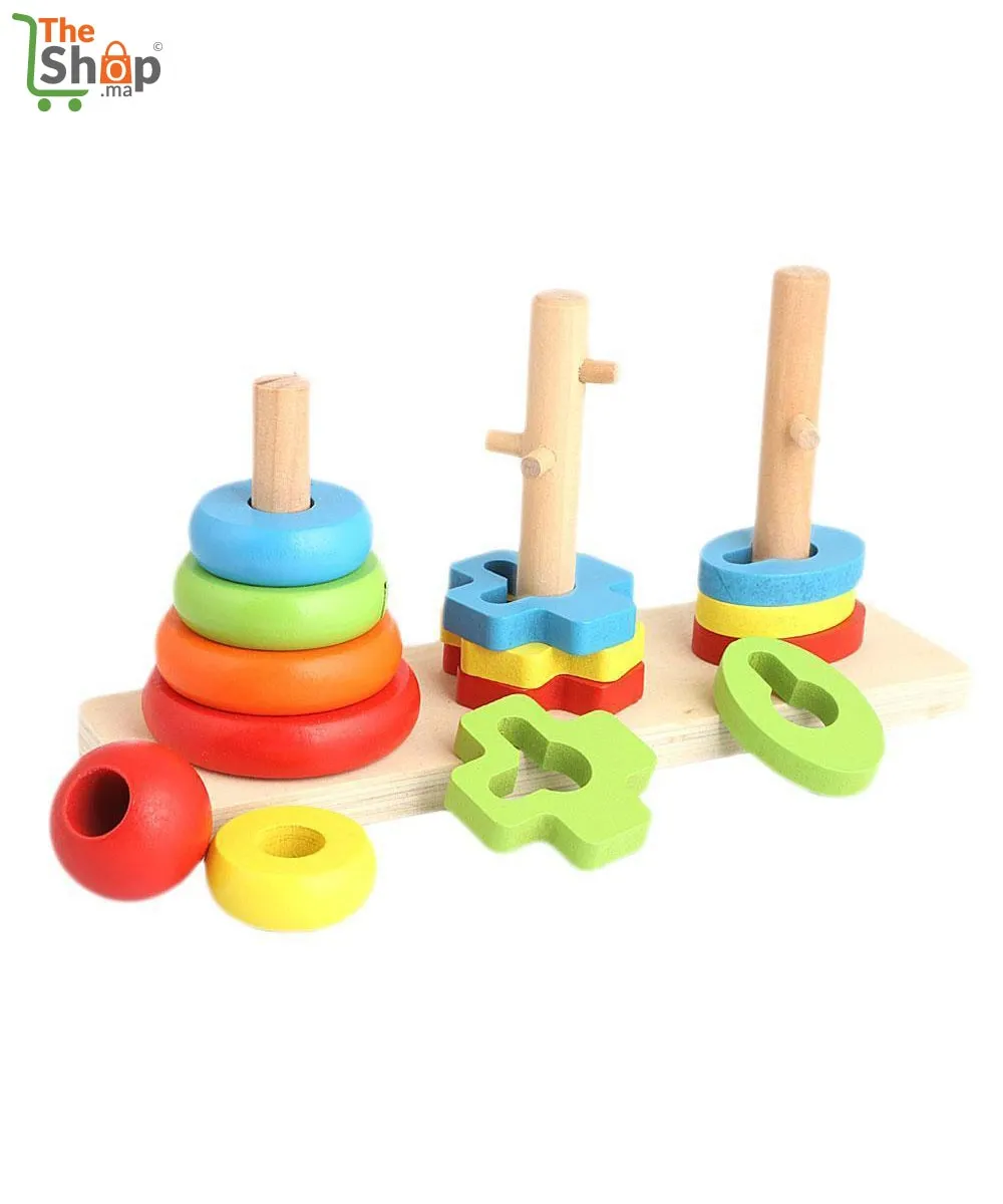 Tour géométrique Montessori à trois colonnes, Jeu d’apprentissage ludique et amusant. Constitué de 3 colonnes, il s’agit pour l’apprenti de réussir à placer les anneaux du plus grand au plus petit avant de compléter par la sphére. Les deux autres colonnes abordent l’intelligence et le sens logique de l’enfant. Il doit réussir à insérer les piéces en tournant les formes sur les tourniquets. Jeu d’intelligence, il permet à l’enfant d’asseoir son autonomie, de stimuler son sens logique et de renforcer ses capacités motrices manuelles. Tout en bois et en couleurs.