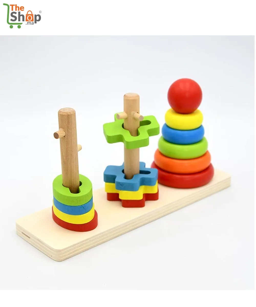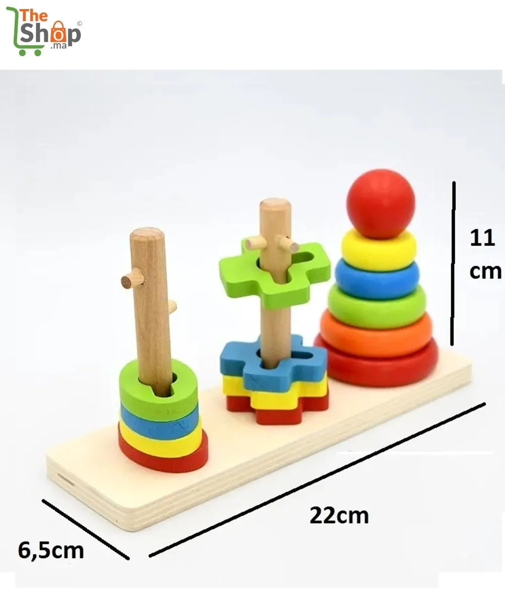 Jeu tout en bois d’apprentissage et d’intelligence Trier, assembler, empiler, identifier les couleurs Renforce les capacités motrices et intellectuelles de l’enfant Stimuler le sens logique et la résolution de problèmes Outil basé sur la méthode Montessori