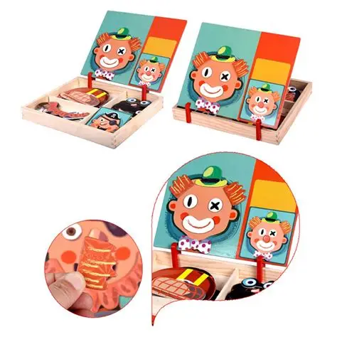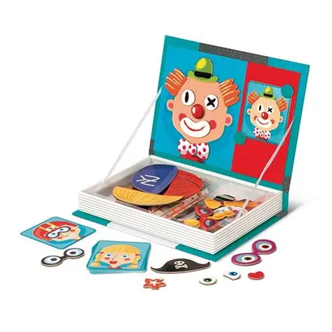Il  comprend des cartes de références avec des portraits visage servant de modèle pour l’enfant ainsi que plusieurs pièces et accessoires aimantés pour reproduire les portraits des différents personnages.